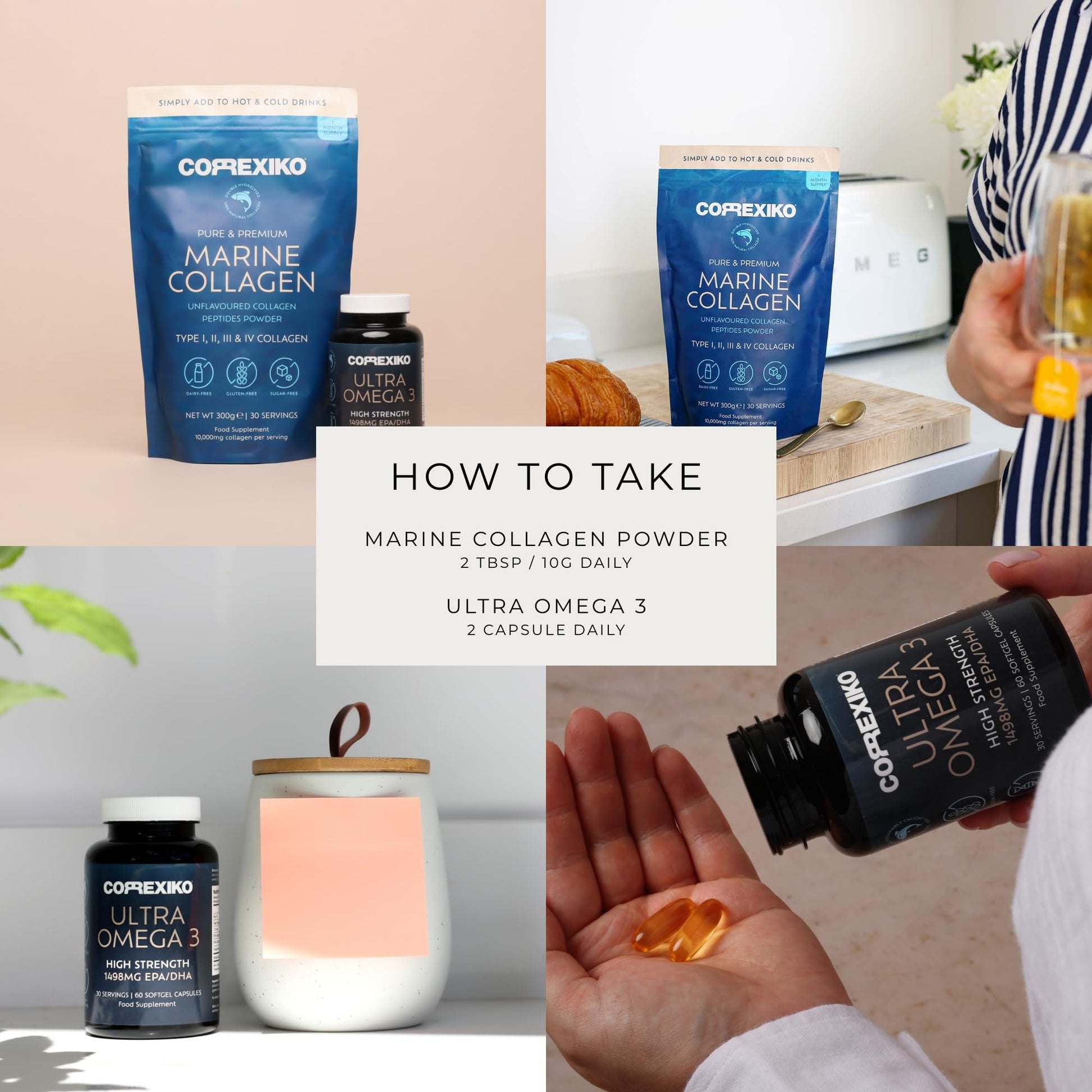 - WHAT'S INSIDE THE PACK: This value bundle contains a 30 day supply of both unfllavoured Marine Collagen powder (300g) and Ultra Omega 3 capsules. As we age, our levels of collagen drop which can impact the health of our skin, hair, nails and joints. Serums and creams help to reduce surface level signs of ageing however collagen can tackle the problem from the inside out. An Omega 3 supplement works with collagen to maximise effects and help improve the health of hair, skin and nails.
