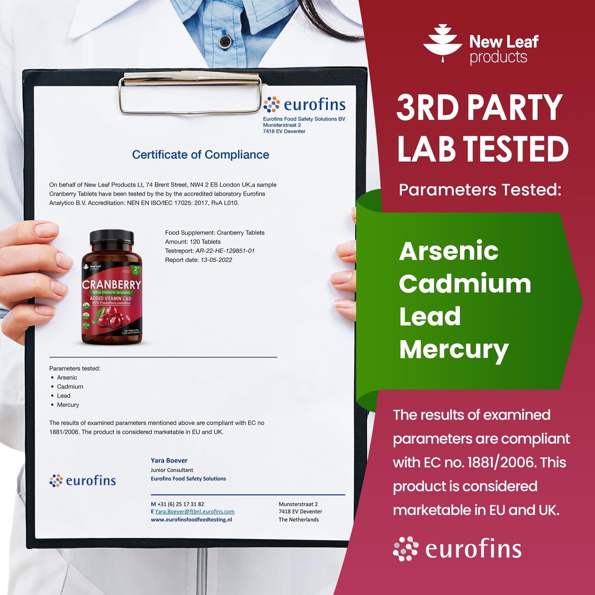Cranberry Tablets Triple Strength 30,000mg - 120 Cranberry Supplements Enriched with Vitamin C & D - Cranberry Supplements for Women and Men - Vegan Cranberry Tablets Made in UK by New Leaf