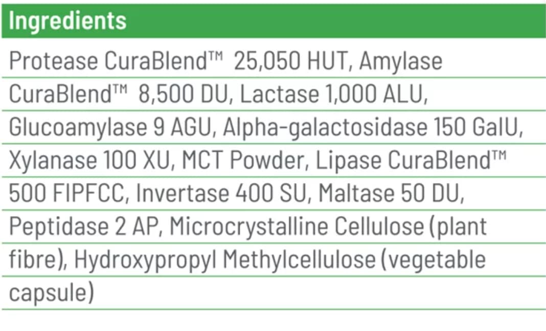 CuraZyme Vital is a specialised blend of 10 pharmaceutical-grade digestive enzymes utilising MCT as an accelerator. Alongside the key CuraBlend ingredients, the MCT accelerator not only helps this gentle enzyme formula significantly speed up, but it also increases the potency of the digestive enzymes. Created to jump-start digestion in the upper stomach, CuraZyme Vital works synergistically with the body’s own enzymes to help ensure nutrient availability. Supplementing each meal with a CuraZyme capsule can make all the difference to your digestive health. The digestive enzymes sourced for the CuraZyme products are very stable, resist damage caused by the stomach acid and are effective throughout the entire pH range of the gastrointestinal tract. Since this pH varies from very acid to alkaline, it is important to choose products that utilise modern technologies such as the CuraBlend process, which carefully selects multiple variants of proteases, amylases and lipases and blends these isoenzymes together, so they effectively break down proteins, carbohydrates and fats no matter which pH environment the enzymes are working in.More Info