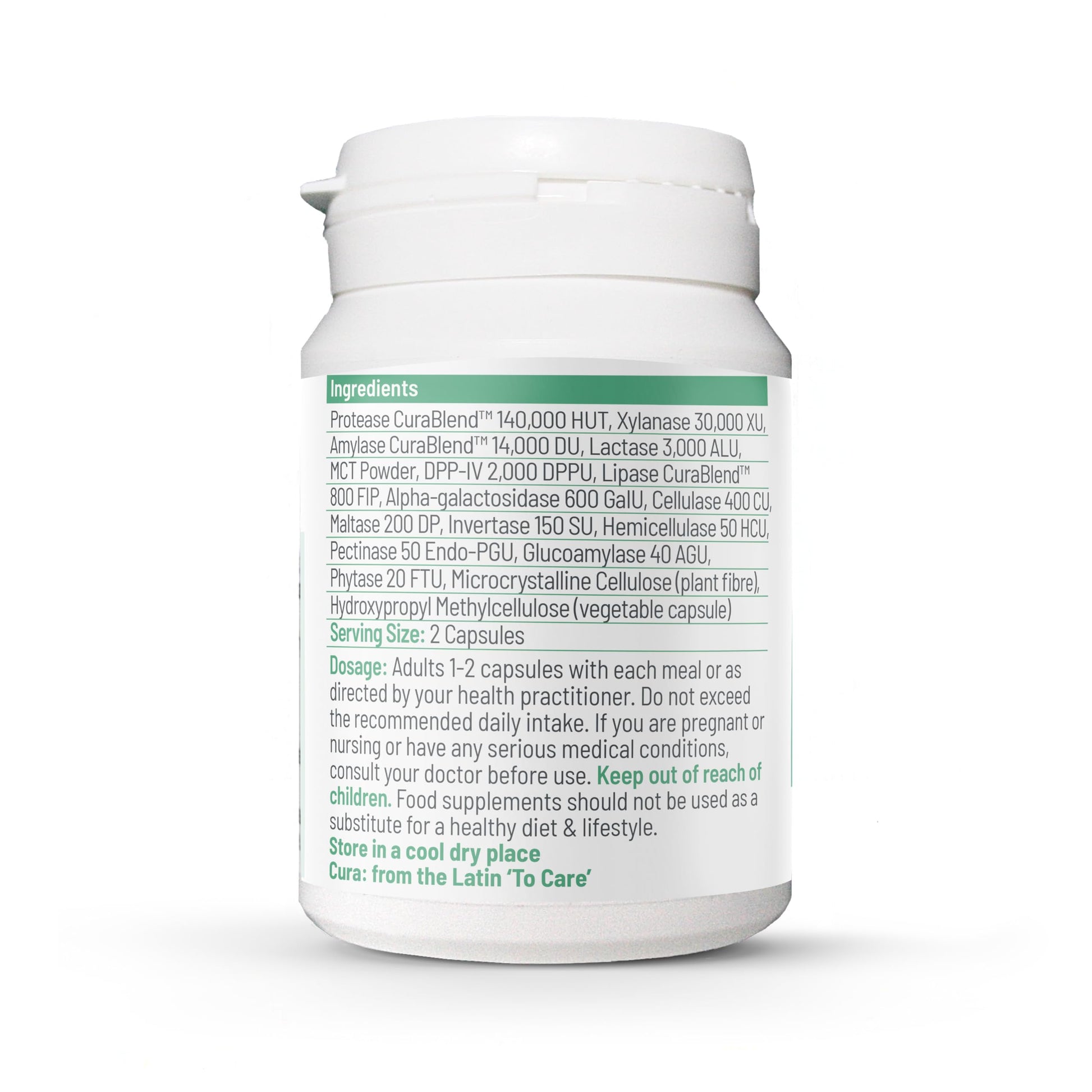 Extra strong food intolerance formula. CuraZyme Tolerance is a specialised blend of 14 pharmaceutical-grade, vegan enzymes which are specially formulated to tackle food intolerances quickly and effectively, particularly gluten, lactose, casein, phenols, beans, soy, legumes and lentils.An intolerance reaction happens when food triggers tummy troubles like gas, bloating, constipation or diarrhoea, usually within 3-5 hours of eating, and can be caused by healthy and unhealthy foods alike. Our ability to naturally produce digestive enzymes can easily be disrupted by stress, poor sleep, low stomach acid, medication, or an episode of food poisoning. Cura Nutrition’s Tolerance formula contains enzymes that target the intolerance molecules that most often cause digestive problems. They reduce the gut’s workload and prevent further irritation, gas, bloating, wind, constipation or diarrhoea.More Info
