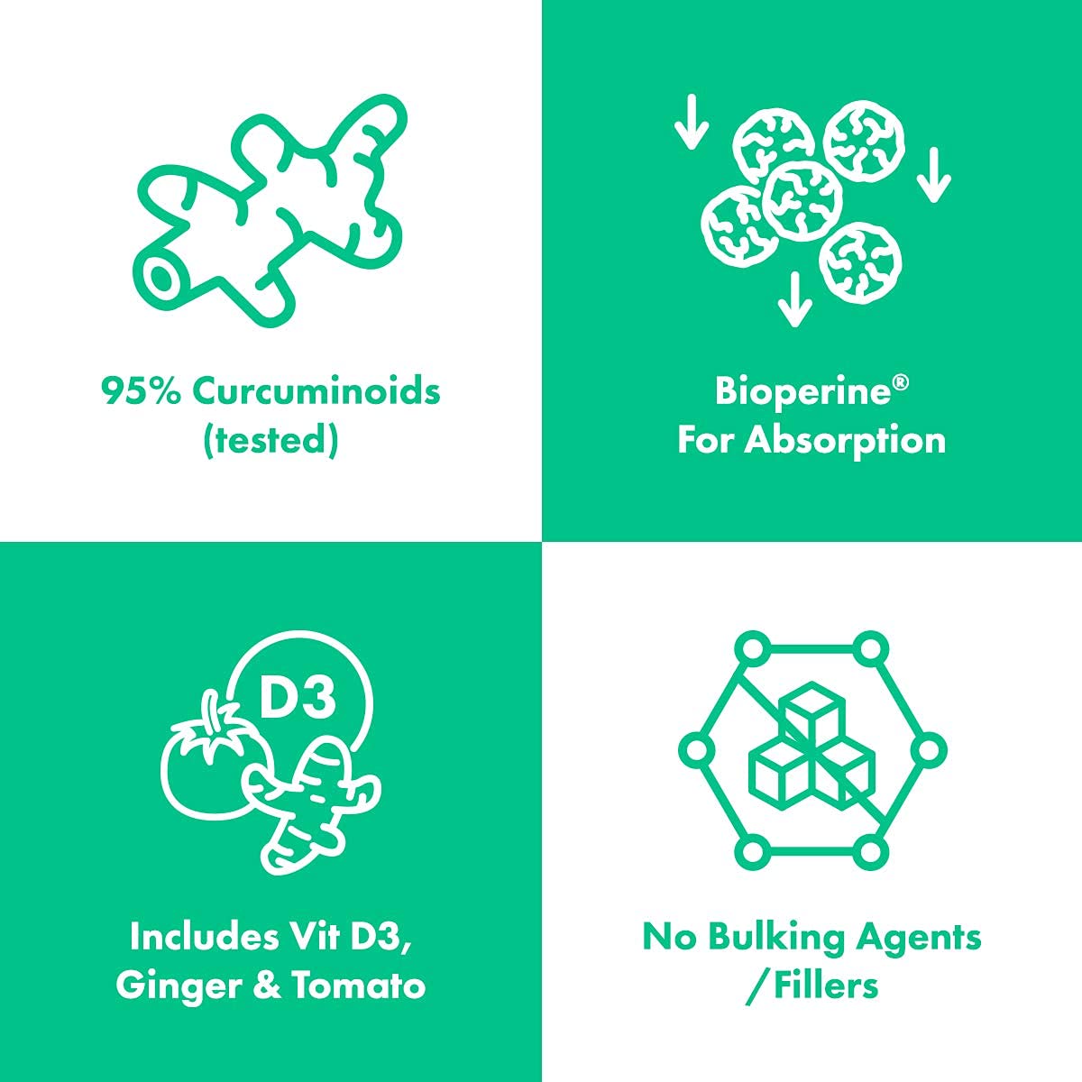 - Much Higher Active Curcuminoids than regular Tumeric - providing 250mg of PURE CURCUMIN per Capsule - Potent Antioxidant Properties.