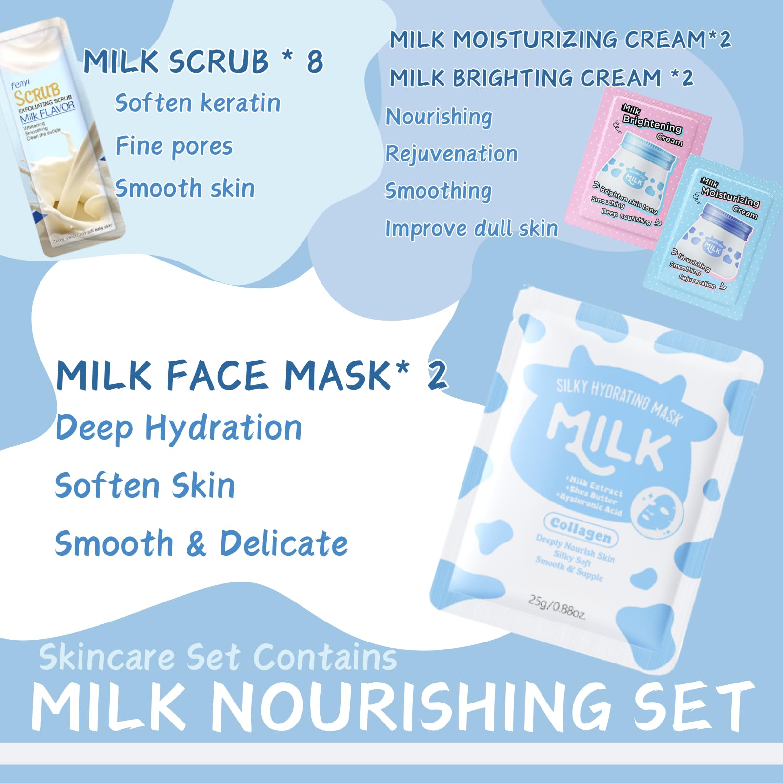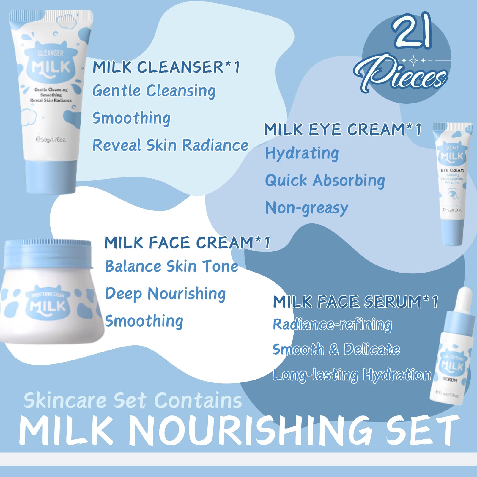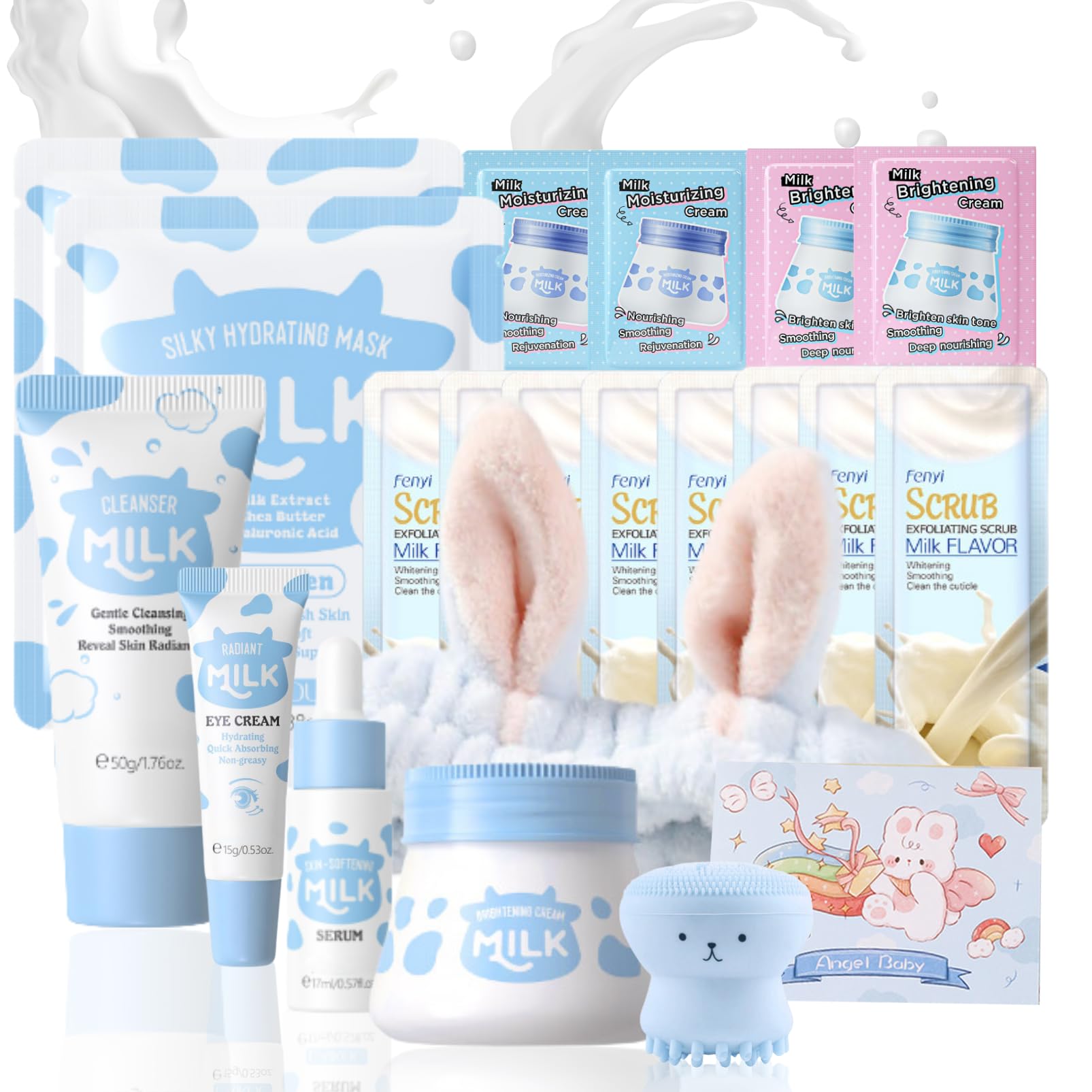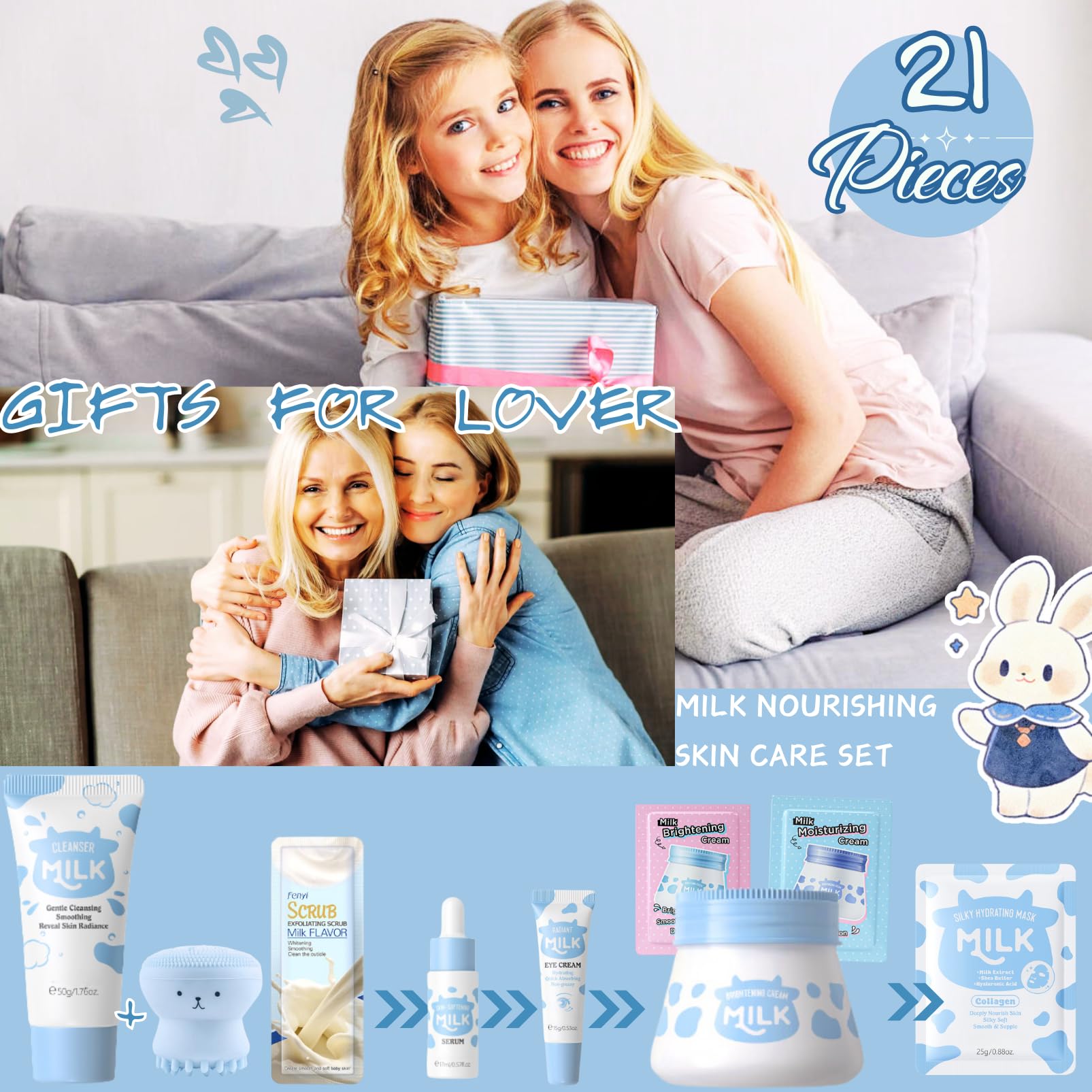 Cureluxe 21pcs Milk Skin Care Sets & Kits - Milk Beauty Gifts for Teenage Girls - Nourish Skin Pamper Gifts for Women Kit with Cleanser,Eyecream,Cream,Serum,Scrub,Mask,Brush,Headband,Lovely Greet Card