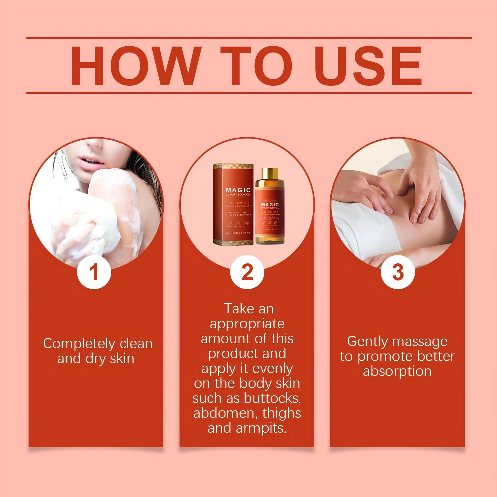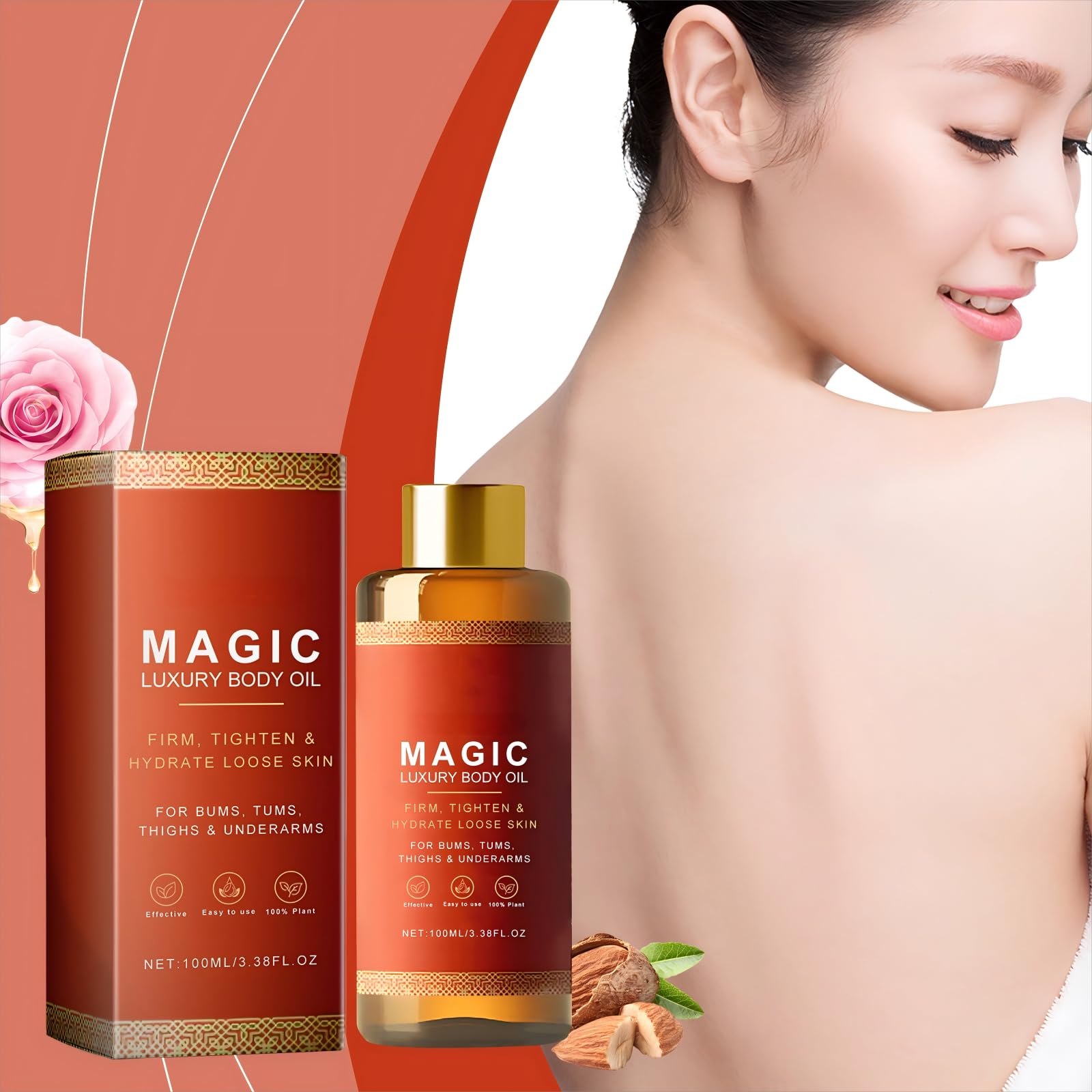 Indulge in our 100ml Magic Body Firming Oil. With natural ingredients, it deeply moisturizes without greasiness. Ideal for massage, it relaxes muscles. Easy to apply, it suits all skin types, giving you radiant, nourished skin.