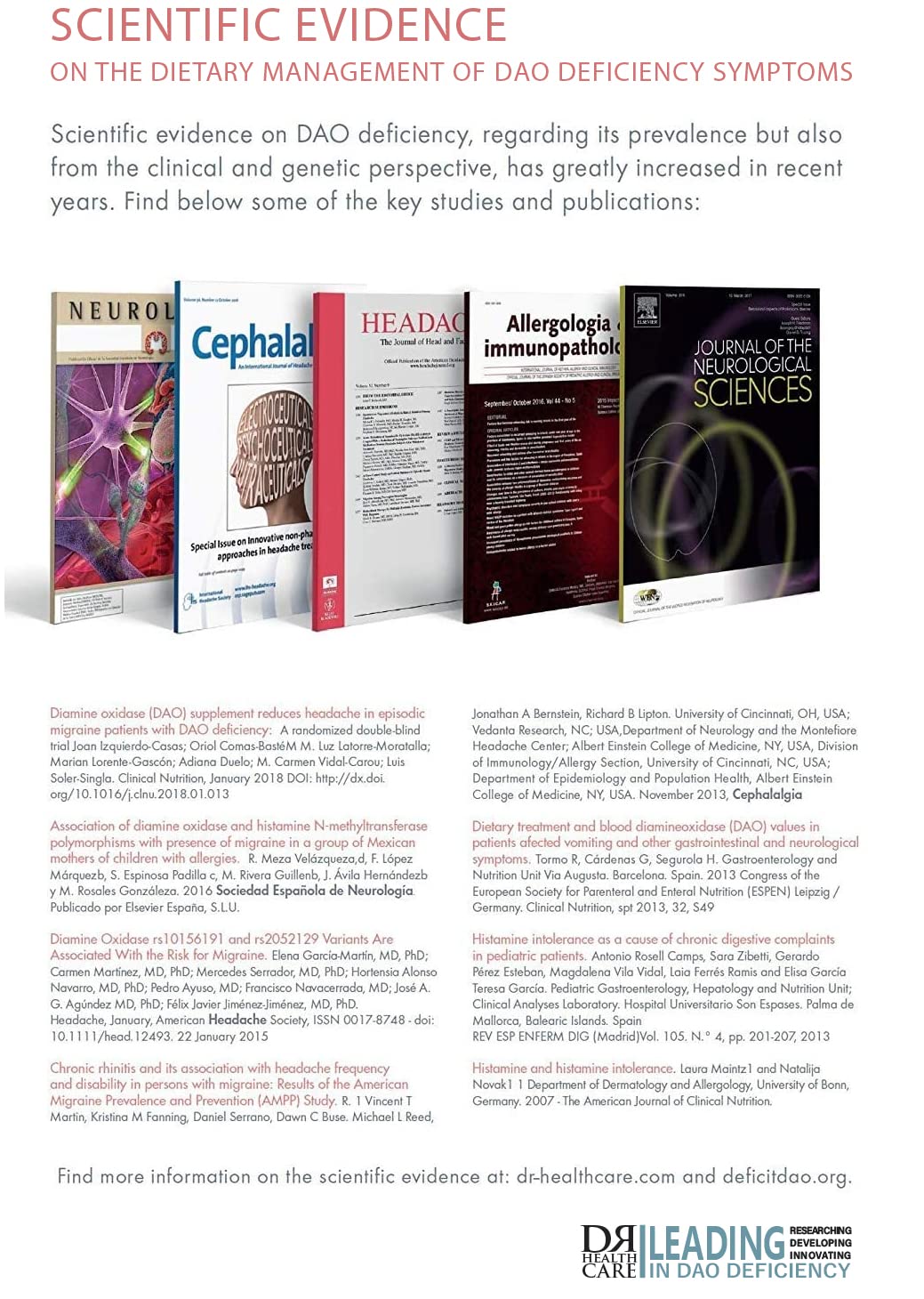 DAOhead is a Food for Special Medical Uses (FSMP) indicated for the management of migraine caused by Deficiency of the enzyme DiAmino Oxidase (DAO)/Histamine intolerance - Contains DAO enzyme of high activity and bioavailability - Includes Vitamins B6, B9 and B12 and Caffeine as Active ingredients adjuncts in the management of migraine caused by DAO deficiency/Histamine Intolerance - 60 TABLETS with Gastro-resistant Coating and CAPSULES with EFICAPS Technology for Controlled Release of Active Ingredients. Foods for special medical purposes, unlike supplements, are foods specially prepared or formulated and intended for the management of patients, including infants, under medical supervision, to fully or partially satisfy the nutritional needs of patients whose capacity to ingest, digest, absorb, metabolize or excrete normal foods or certain nutrients or metabolites thereof is limited, or deficient, or is altered, or that they require other clinically determined nutrients, and that management cannot be carried out solely by modifying the normal diet.More Info
