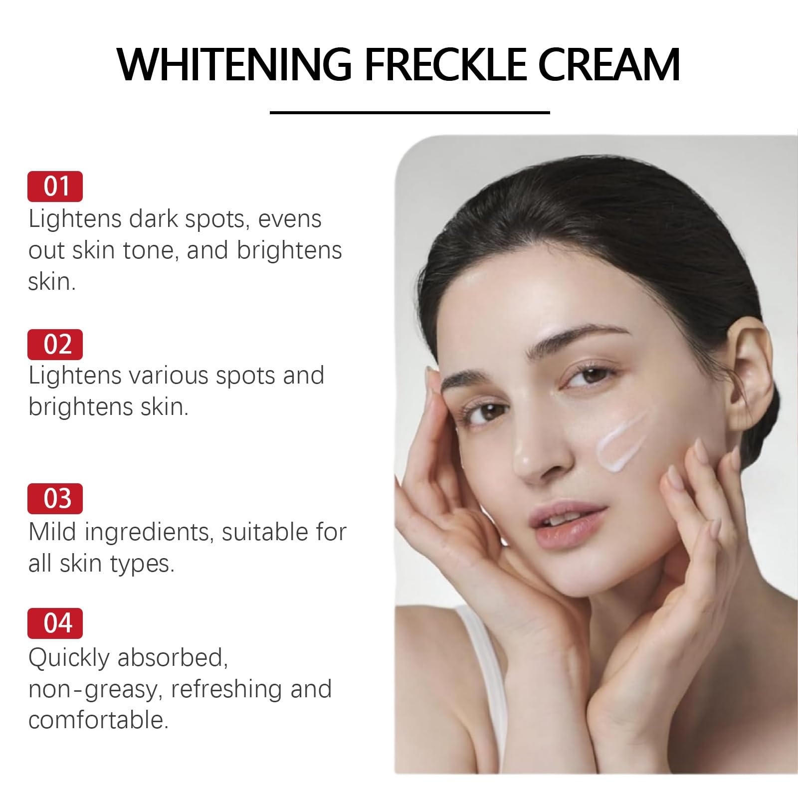 3.The whitening cream helps you improve dark spots, fade pigmentation and brighten your complexion.<br>