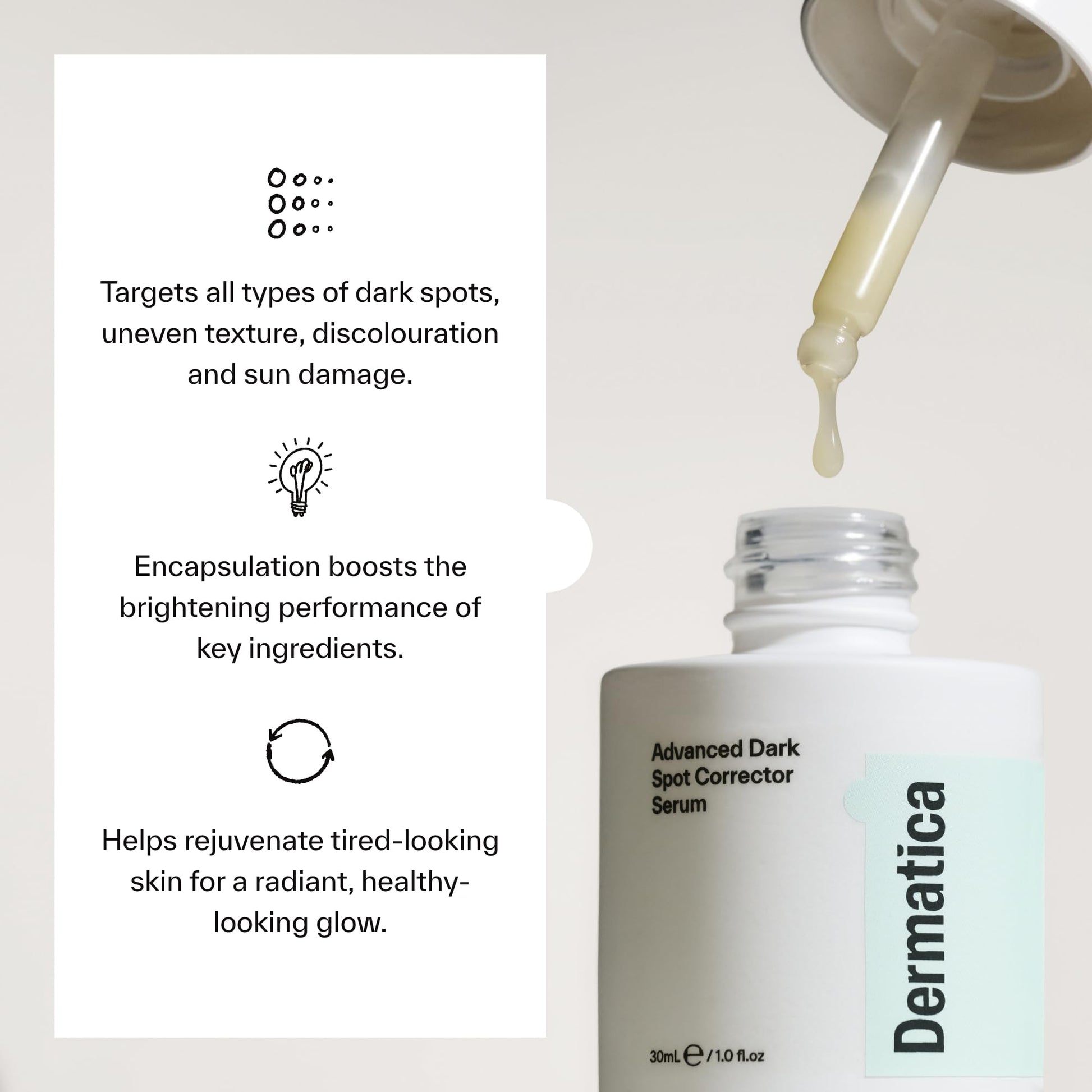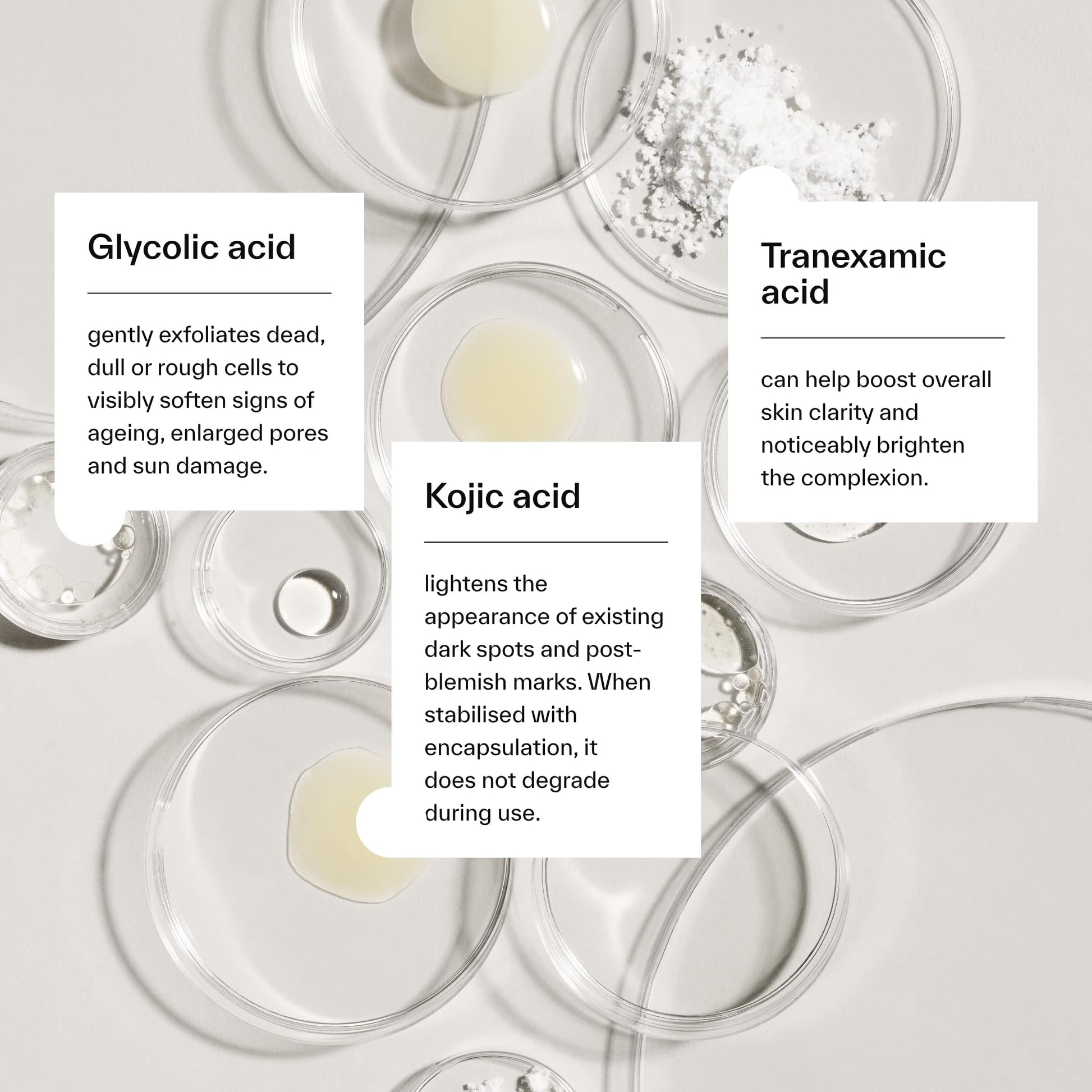 Advanced Dark Spot Corrector Serum is designed with dermatologists to treat all types of dark spots smarter, not harsher. Formulated with three evidence-based active ingredients and cutting-edge encapsulation technology, this intelligent serum helps to brighten and unify uneven skin tone, without feeling unnecessarily harsh on the skin. - 1% Encapsulated Kojic Acid lightens the appearance of existing dark spots and post-blemish marks. Stabilised with encapsulation, it does not degrade during use. - 5% Encapsulated Glycolic Acid gently exfoliates dead, dull or rough cells to visibly soften signs of ageing, enlarged pores and sun damage. Controlled release encapsulation gradually releases the ingredient throughout the day, promoting a radiant complexion without feeling too harsh on the skin. - 3% Tranexamic Acid helps boost overall skin clarity – noticeably brightening the complexion. Advanced Dark Spot Corrector Serum’s visible anti-ageing benefits also help to rejuvenate dull, tired-looking complexions and restore healthy radiance and smoothness. Supporting ingredients include: - Antioxidant niacinamide - Brightening liquorice root extract - Hydrating glycerin and panthenol Advanced Dark Spot Corrector Serum is suitable for a wide range of skin types (excluding sensitive skin), and all skin tones. This product contains tranexamic acid and is therefore not recommended during pregnancy or while breastfeeding. It is available to purchase without a prescription. 95% agree that their skin looked brighter after 8 weeks"* *Proven via independent user trial on Advanced Dark Spot Corrector Serum over 8 weeks on 60 participants.More Info