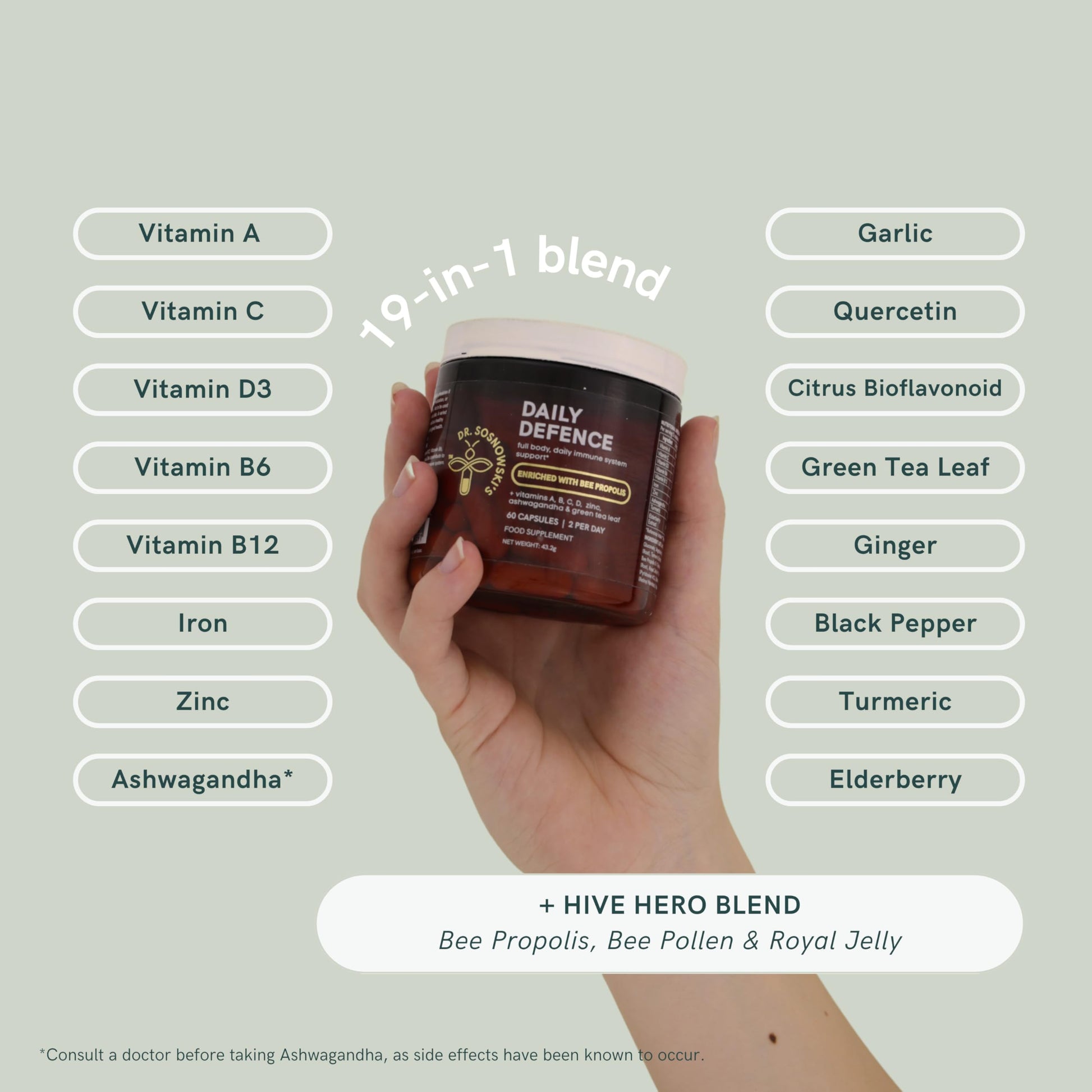 Daily Defence Immunity Supplements by Dr Sosnowski's | Essential Daily Multi-Vitamin with Bee Propolis, Pollen & Royal Jelly, Vegetable Capsules, 60ctMore Info