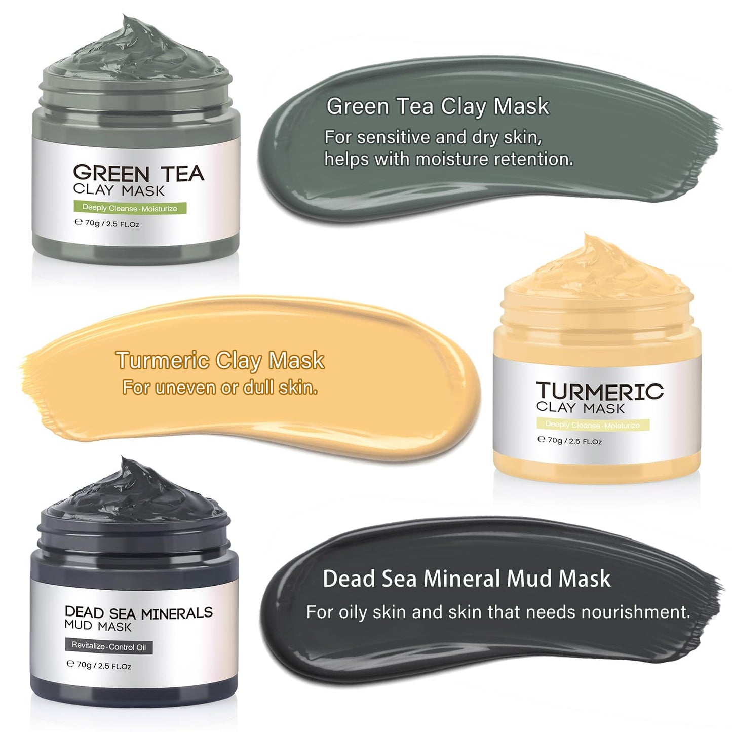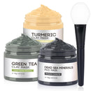 DUNTAIL Clay Mask Set – Face Masks Skincare with Turmeric, Dead Sea Mud & Green Tea for Deep Cleansing and Oil Control (3 x 70g)