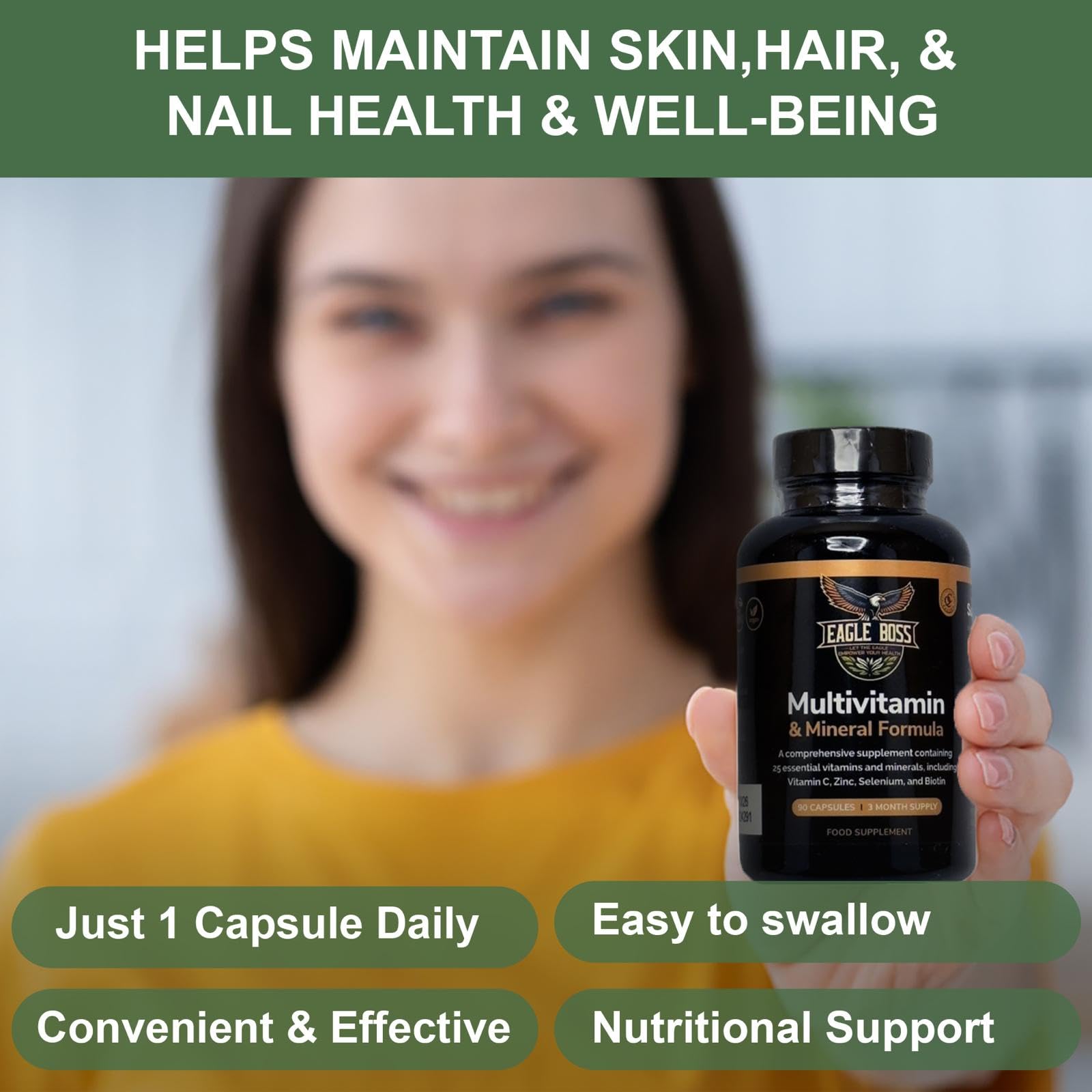 Product Description: Experience comprehensive wellness with our premium UK-made Multivitamin and Mineral Supplement. Crafted from high-quality, scratch ingredients, each capsule delivers a carefully balanced blend of essential vitamins and minerals to support your overall health. Key Features: - High Potency Vitamins: This supplement boasts high levels of key vitamins, including Vitamin E (67.11mg, 559% RI), Vitamin B6 (15mg, 1,071% RI), and Vitamin B2 (15mg, 1,071% RI), which are vital for energy metabolism, antioxidant protection, and overall well-being. - Comprehensive Mineral Support: It provides essential minerals such as Zinc (10mg, 100% RI), Selenium (100μg, 182% RI), and Iron (5mg, 38%) to support immune function, cognitive health, and red blood cell production. - Enhanced Vitamin D3: Each capsule includes 20μg (800 IU) of Vitamin D3 (400% RI) for optimal bone health and immune system support. - Rich in B Vitamins: The formulation includes a broad spectrum of B vitamins including B1 (10mg, 909% RI), B3 (15mg, 94% RI), B5 (20mg, 333% RI), and B12 (500μg each of adenosylcobalamin and methylcobalamin, 2,000% RI) to aid in energy production and cognitive function. - Support for Overall Health: The supplement also contains Vitamin A (750μg, 94% RI), Vitamin K2 (50μg, 68% RI), and a range of trace elements like Manganese and Copper to ensure complete nutritional support. - Convenient 3-Month Supply: Each bottle provides a 3-month supply of 1 capsule per day, making it easy to incorporate into your daily routine. - Vegan and Halal Friendly: Encased in a vegetable cellulose capsule, our multivitamin is suitable for vegans and adheres to Halal standards. - Purity and Quality: Made from natural, high-quality UK-based materials, ensuring you receive a supplement free from artificial additives and preservatives. Elevate your health regimen with our multivitamin and mineral supplement, meticulously designed to deliver the essential nutrients your body needs for optimal health and vitality.More Info