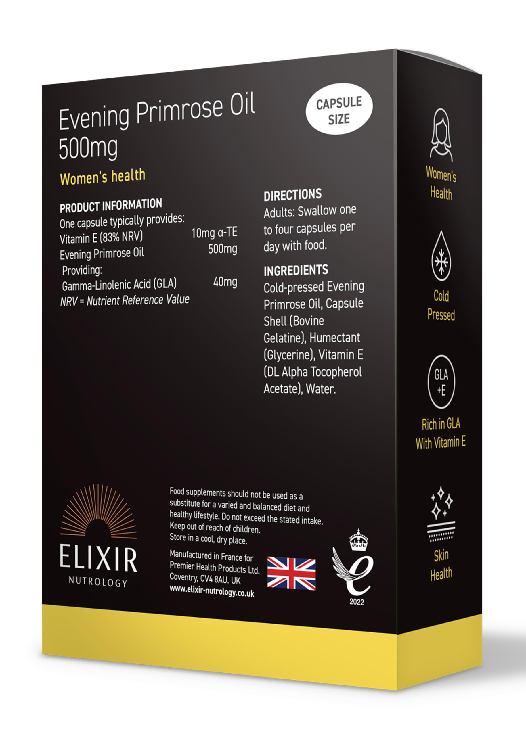 Experience the natural benefits of Elixir Nutrology Evening Primrose Oil 500mg, a premium supplement designed to promote overall health and wellness. This high-quality oil is rich in Gamma-Linolenic Acid (GLA), an essential fatty acid that plays an important role in maintaining women’s health, particularly in supporting hormonal balance and reproductive health. Each softgel is enhanced with Vitamin E, a powerful antioxidant that helps protect your cells from oxidative damage and supports the maintenance of healthy skin. Vitamin E contributes to normal skin health, keeping your skin nourished and glowing with vitality. Crafted using a cold-pressed extraction method, Elixir Evening Primrose Oil preserves the maximum amount of beneficial nutrients, ensuring you receive the highest quality oil for your daily wellness needs. Dosage: Adults take one to four capsules per day with food.More Info