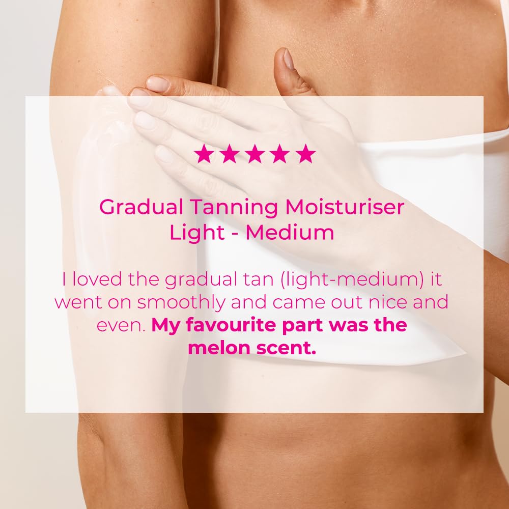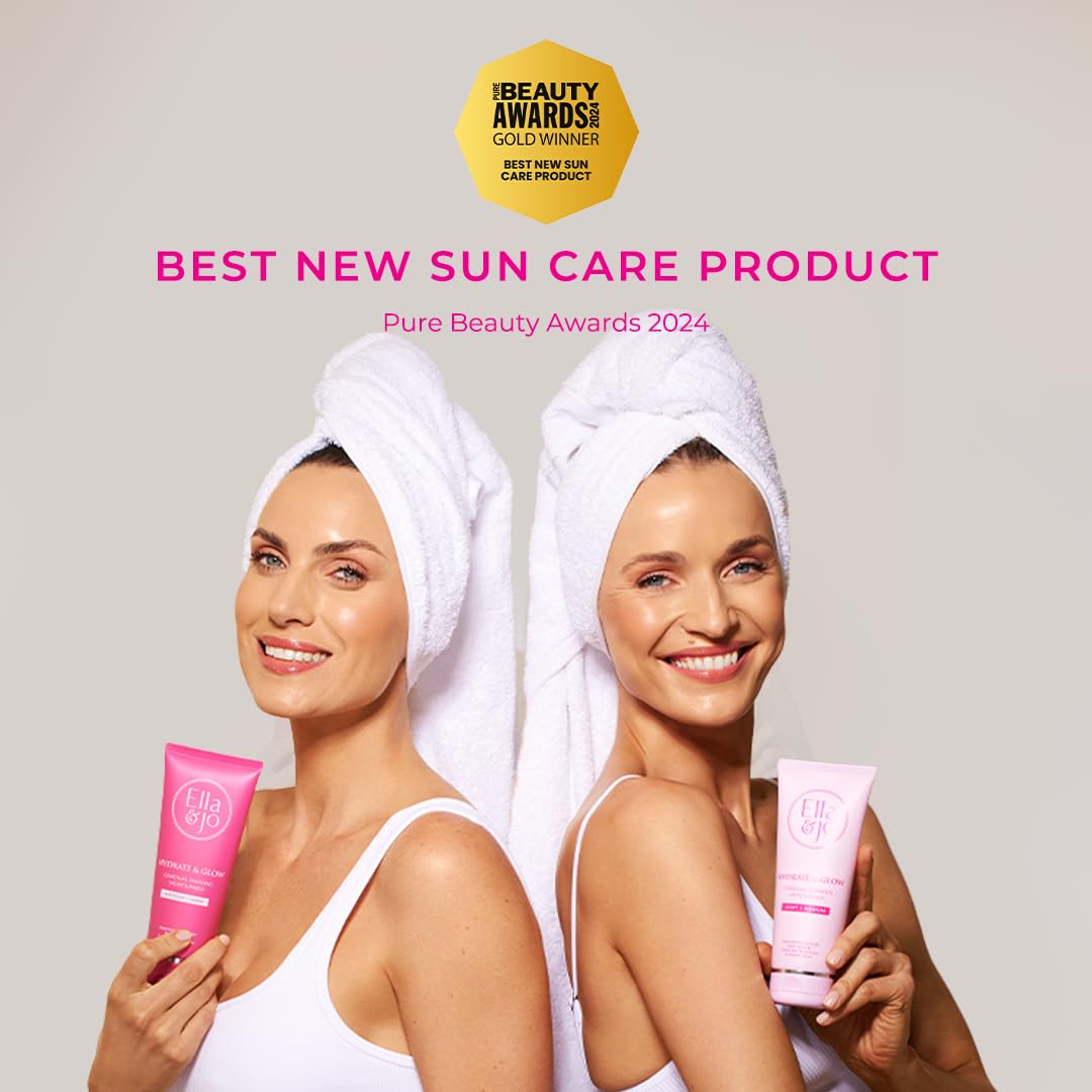 Ella & Jo our Glow Tanning Range encourages you to embrace your unique radiance with our Hydrate & Glow Gradual Moisturiser.. Whether you prefer a subtle luminosity or a deeper, more sultry hue, our exquisite formulations cater to your every desire, ensuring that your glow is as individual as you are. With our Light to Medium self tanning cream you can cxperience a gradual, natural-looking tan while indulging in deep skin nourishment. Our tanning lotion combines the hydrating power of glycerin, the skin-reviving benefits of Hyaluronic acid, and the nourishing properties of Squalane and antioxidant protection of vitamin E. Enjoy the delightful Tropical Watermelon Scent of our fake tan moisturiser, which leaves no fake tan smell after application. This multipurpose no-transfer self tanning lotion can be used on its own or over your developing mousse/liquid tan to enhance the depth, even out streaks, or prolong the lifespan of your natural or applied tan. It’s packed with hydrating ingredients such as Hyaluronic Acid, Squalane, Glycerin, and Vitamin E, which nourish the skin and add a sun-kissed glow. With our fake tan medium, You have complete control over your tan: applying the gradual tanning moisturiser daily or as needed to achieve and maintain your desired level of tan. Plus, you can apply this no-transfer gradual tan moisturiser either in the morning or evening without worries about it transferring onto your clothing or bedsheets.More Info