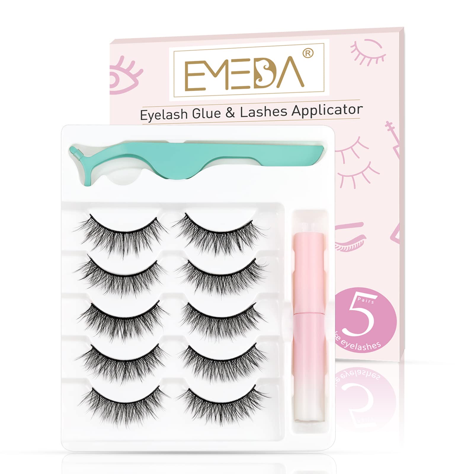 EMEDA Natural lashes with glue and tweezers 5 Pair Natural look eyelashes with lash glue 3D Short Natural false lashes Kit Strip Fake Lashes With Applicator (Natural 1)