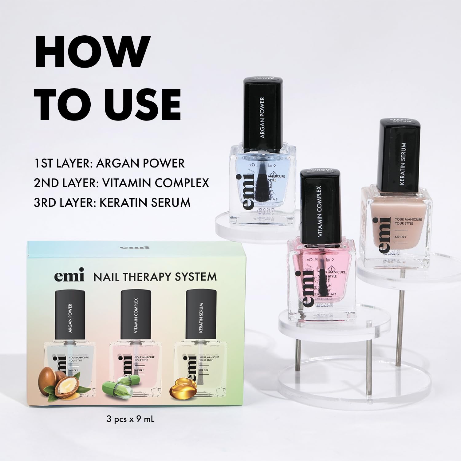 Introducing our Nail Care Power Trio - the ultimate solution for achieving strong, healthy, and beautifully nourished nails. This set includes three expertly crafted nail polishes: Argan Power, Vitamin Complex, and Keratin Serum.Argan Power, 9 ml