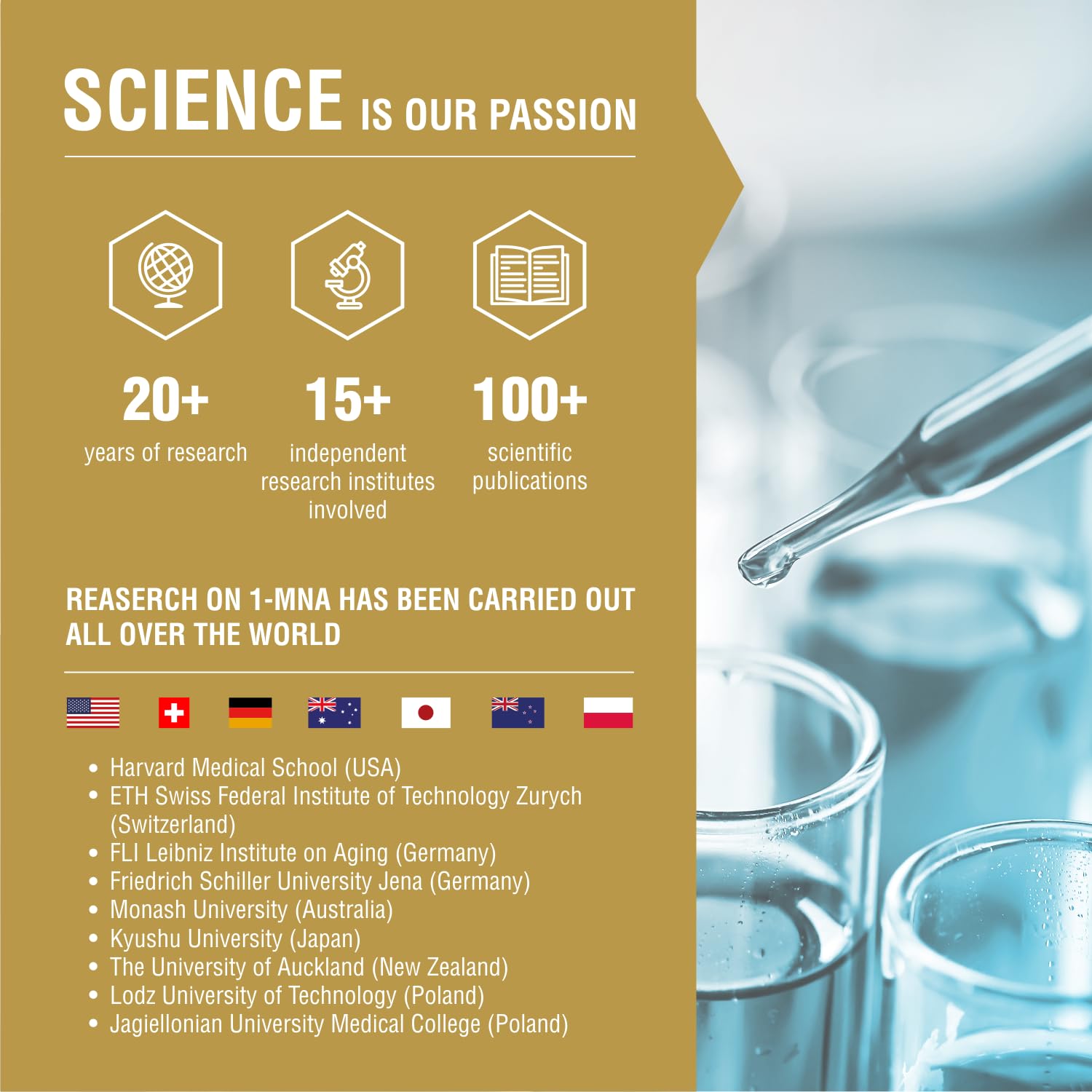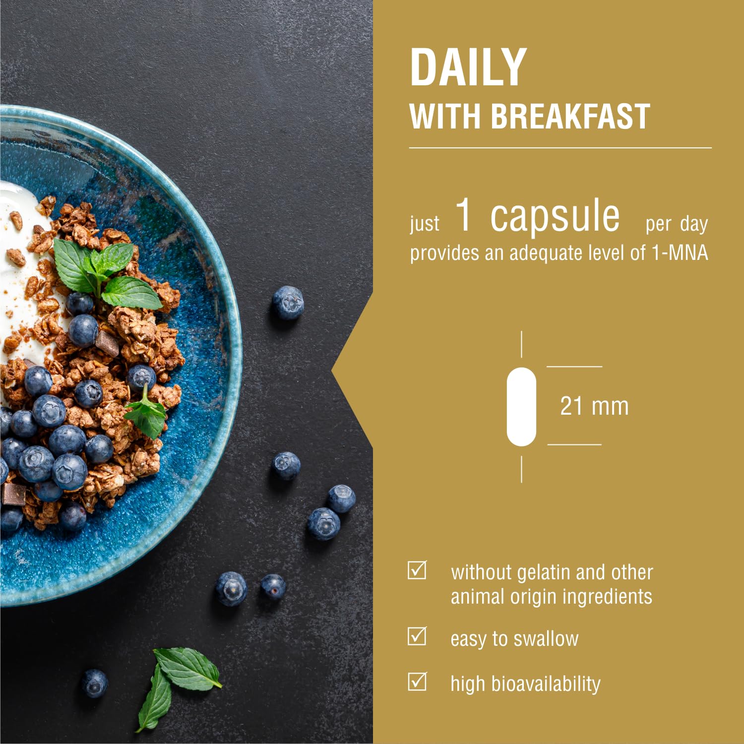 Patented formula of 1-MNA. Scientifically Formulated. Manufactured in the EU. Deemed safe for use by EFSA (European Food Safety Authority). Registered by FDA (Food and Drug Administration). Diet supplement with high bioavailability. Easy to swallow. Ideal for vegan, without gluten, without GMO, without soy, without conservatives, without artificial additives, without ingredients of animal origin or any milk proteins.