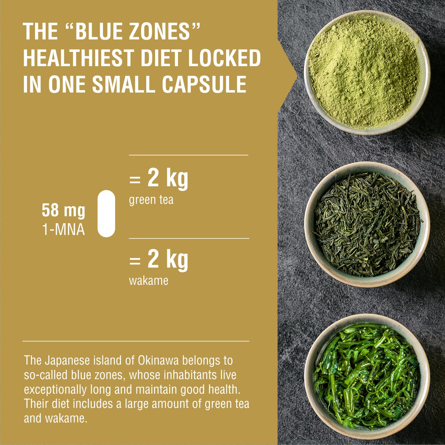 The richest natural source of 1-MNA is wakame algae (Undaria pinnatifida) and green tea leaves (Camellia sinensis). However, to fully use its potential, you'd need to consume 1 kg of these superfoods daily! To help you sort it out, we locked the equivalent of even 2 kg of 1-MNA in just one capsule! One Endotelio pill daily provides a proper level of 1-MNA and complements your diet in 1-MNA.