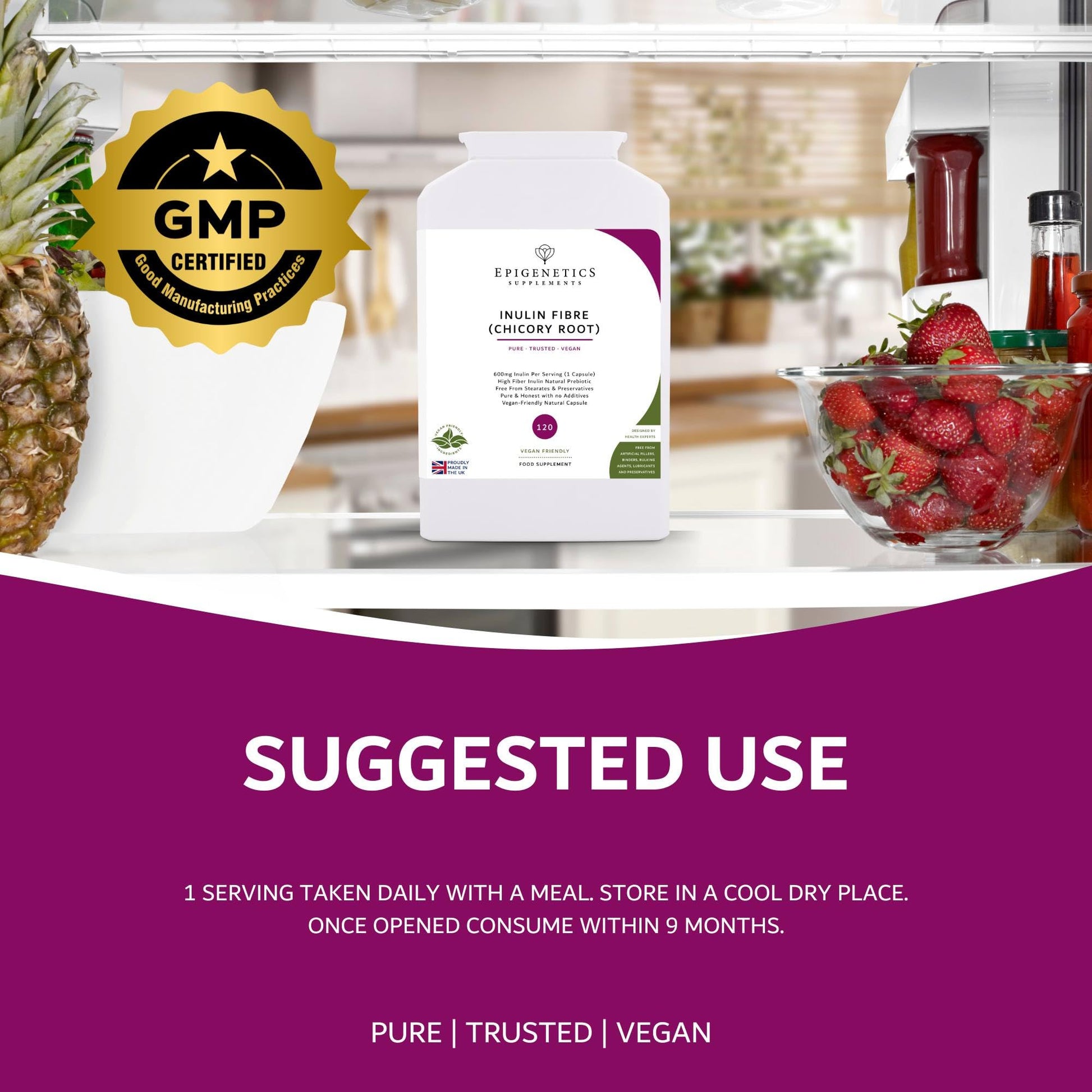 Support your daily fibre intake with Epigenetics Supplements Inulin Fibre, a pure and natural source of dietary fibre made from pure chicory root. Each capsule contains no additives, fillers, colours, or flavourings—just premium high-fibre inulin, providing a convenient and effective way to increase your fibre intake whenever you need it. With 90% fibre by weight, our Inulin Fibre supplement is an excellent choice for anyone looking for an easy way to incorporate more fibre into their diet. Each pack provides a generous 4-month supply, with one serving per day, making it a cost-effective and long-lasting solution for daily fibre support. Designed for effortless delivery, our compact letterbox-friendly packaging ensures convenience while also reducing carbon footprint during shipping. At Epigenetics Supplements, we are committed to sustainability and efficiency, ensuring you receive premium-quality supplements with minimal environmental impact. Proudly made in the UK, our Inulin Fibre is produced under strict GMP (Good Manufacturing Practice) standards, guaranteeing a product that meets the highest levels of quality, purity, and consistency. We respect both your health and the environment—that’s why our Inulin Fibre is 100% vegan-friendly, made exclusively from plant-based ingredients with no animal-derived additives. Choose Pure, Plant-Based Fibre – Choose Epigenetics Supplements Inulin Fibre.More Info