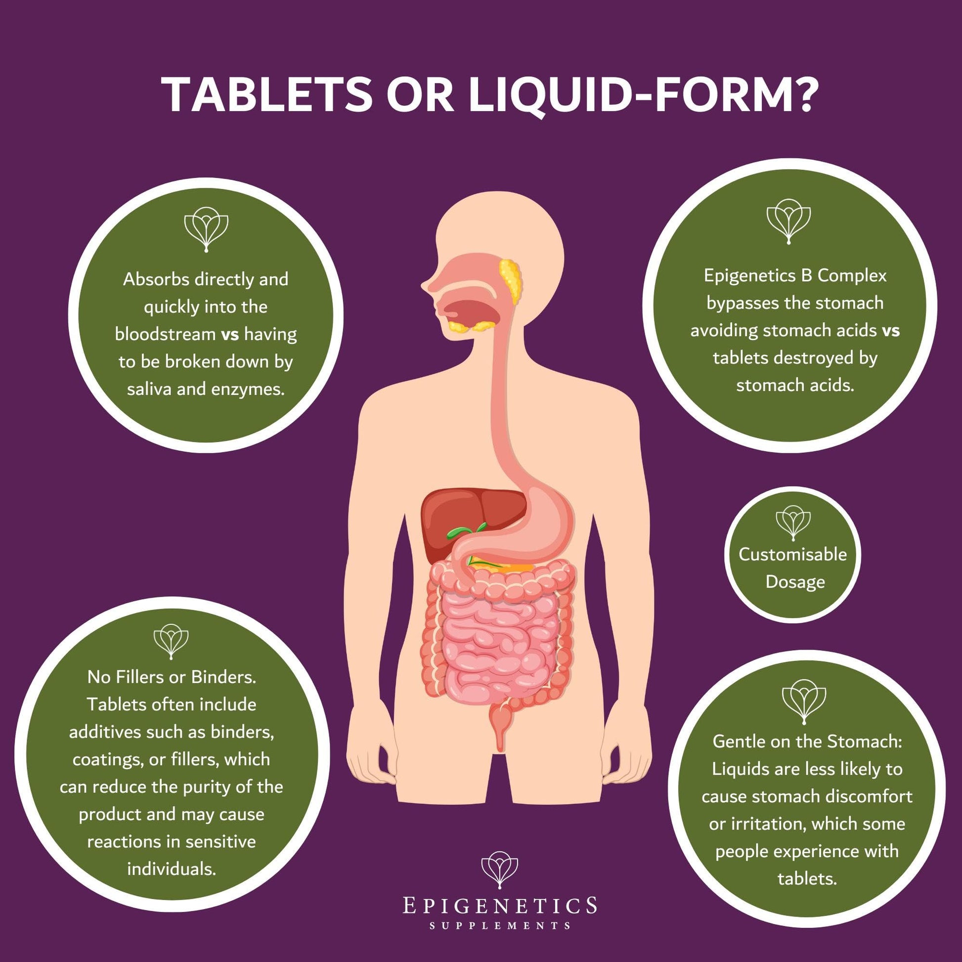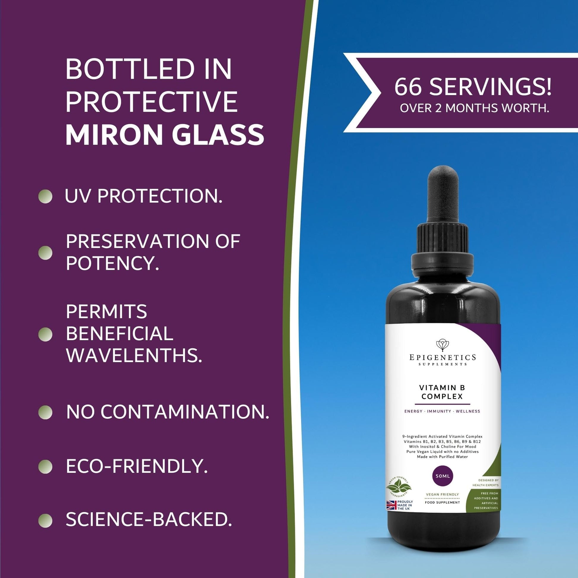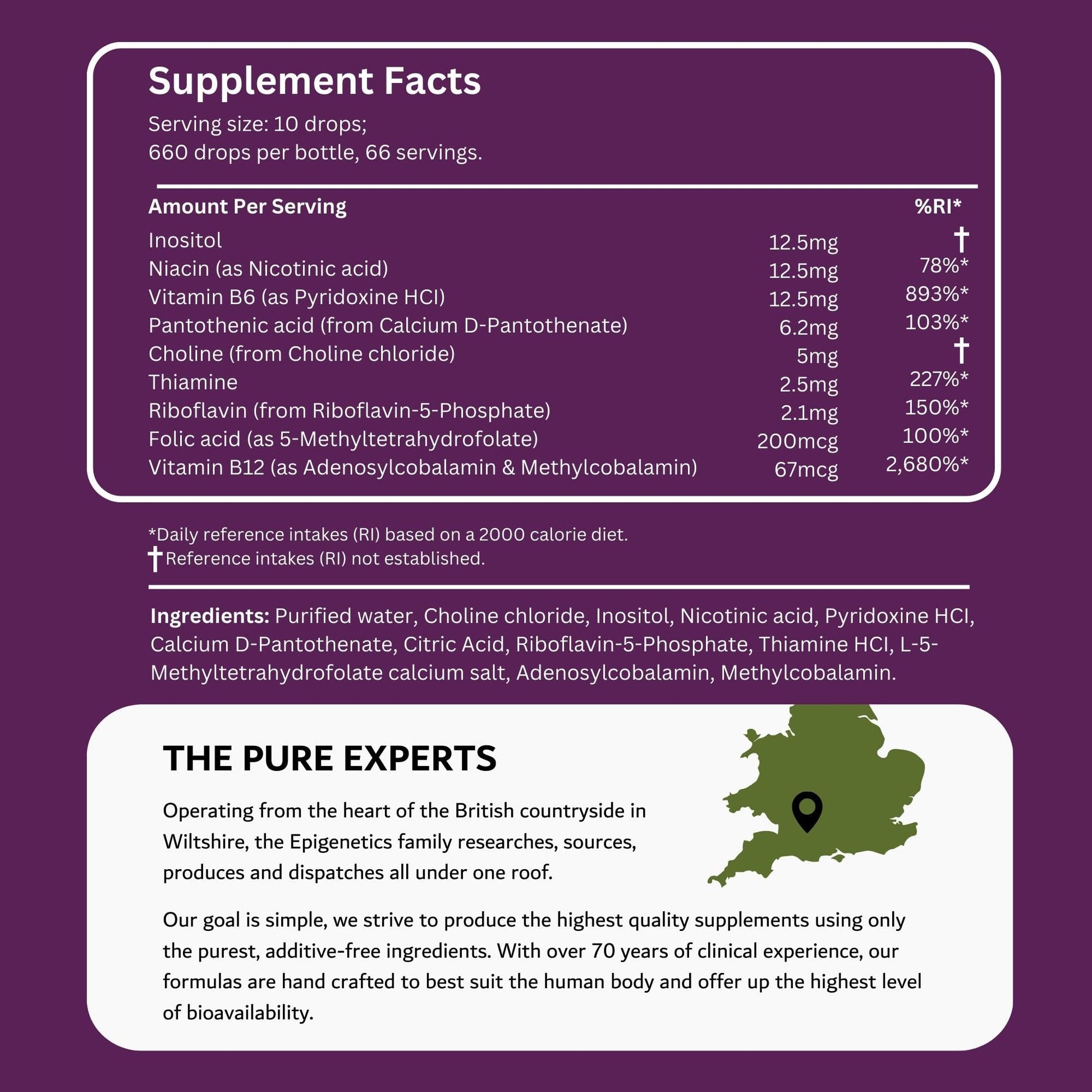 Support your mind and body with Epigenetics Vitamin B Complex Liquid, a carefully crafted formula designed to meet your health needs while respecting nature. This high-quality supplement contributes to the normal functioning of the nervous system, promoting mental performance and psychological health, while supporting energy levels and helping to reduce tiredness and fatigue. Additionally, it aids in maintaining a normal energy-yielding metabolism, keeping you active and vibrant every day. At Epigenetics, we believe in transparency and purity, so our formula includes only the ingredients you need—no additives, fillers, colours, or flavourings. As a liquid, it is in its most bioavailable form, ensuring that your body absorbs and utilises it quickly and efficiently. It’s health support made simple. Each bottle of Epigenetics Vitamin B Complex is packed with 66 servings at the recommended dose of 10 drops per day. That’s a generous two months of daily support to keep you feeling your best. Ordinary packaging just won’t do for a supplement this pure. Epigenetics uses premium Miron Violetglass, which protects against harmful sunlight while allowing UV and infrared light to preserve the freshness and potency of our formula naturally—no preservatives needed. Plus, the bottle is reusable, making it an eco-friendly option for storing other liquids around your home or while travelling. Proudly manufactured by Epigenetics in our state-of-the-art facility in the heart of the British countryside, we adhere to the strictest GMP regulations and guidelines, ensuring that every bottle meets the highest quality standards. With us, your trust matters. At Epigenetics, we’re committed to sustainability and inclusivity. That’s why our Vitamin B Complex is made entirely from vegan-friendly ingredients, respecting both your health and the planet.More Info