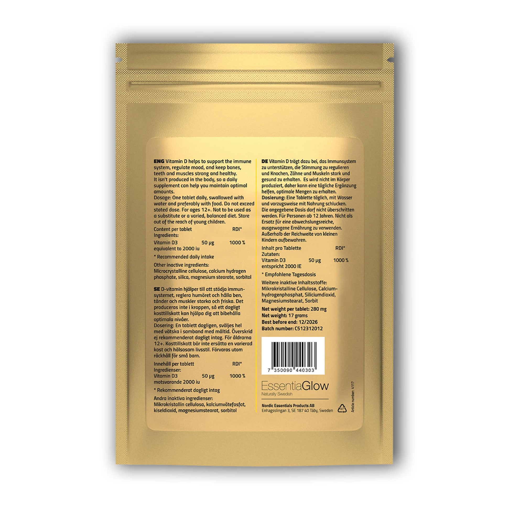 We started ESSENTIAGLOW 20 years ago with a simple idea: let’s build a Swedish company we’d love to be a customer of. Let’s dedicate ourselves to helping people improve their health and wellbeing and get the best out of life. Let’s sell premium quality, affordable products that can work individually or together to support the immune system, good digestion, and energy levels, that help to regulate sleep, and optimise brain, heart, eye, skin and joint health. So that’s what we did.Vitamin D is an essential nutrient that is crucial for overall health and wellbeing. It plays a vital role in helping the body absorb calcium and maintaining strong, healthy bones. It is also linked to improved immune and cognitive function. Our main sources of vitamin D are foods such as oily fish, egg yolks and red meat, and sunlight. But many people don't get enough vitamin D from sunlight and diet alone, especially during the winter months, so taking a daily supplement can help ensure that you maintain optimal amounts of this vital nutrient. This supplement is free from artificial flavours and preservatives, colourants, wheat, fish, gluten, peanuts/nuts, palm oil, lactose, mustard, sesame and sugar. Non-GM, vegetarian, vegan, Kosher, Halal.