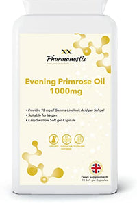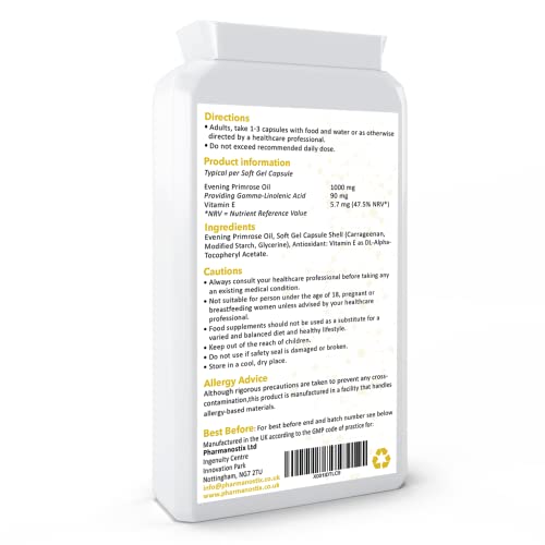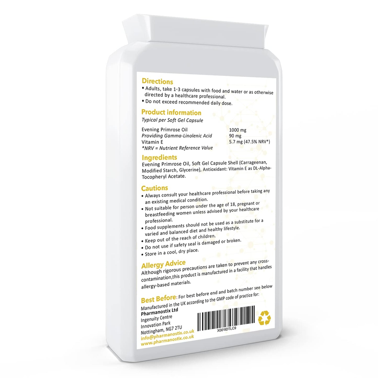 Evening Primrose Oil 1000mg 90 Vegan Softgel Capsules - Cold Pressed - High GLA Formulation with Vitamin E - No GMOs - UK Made by Pharmanostix