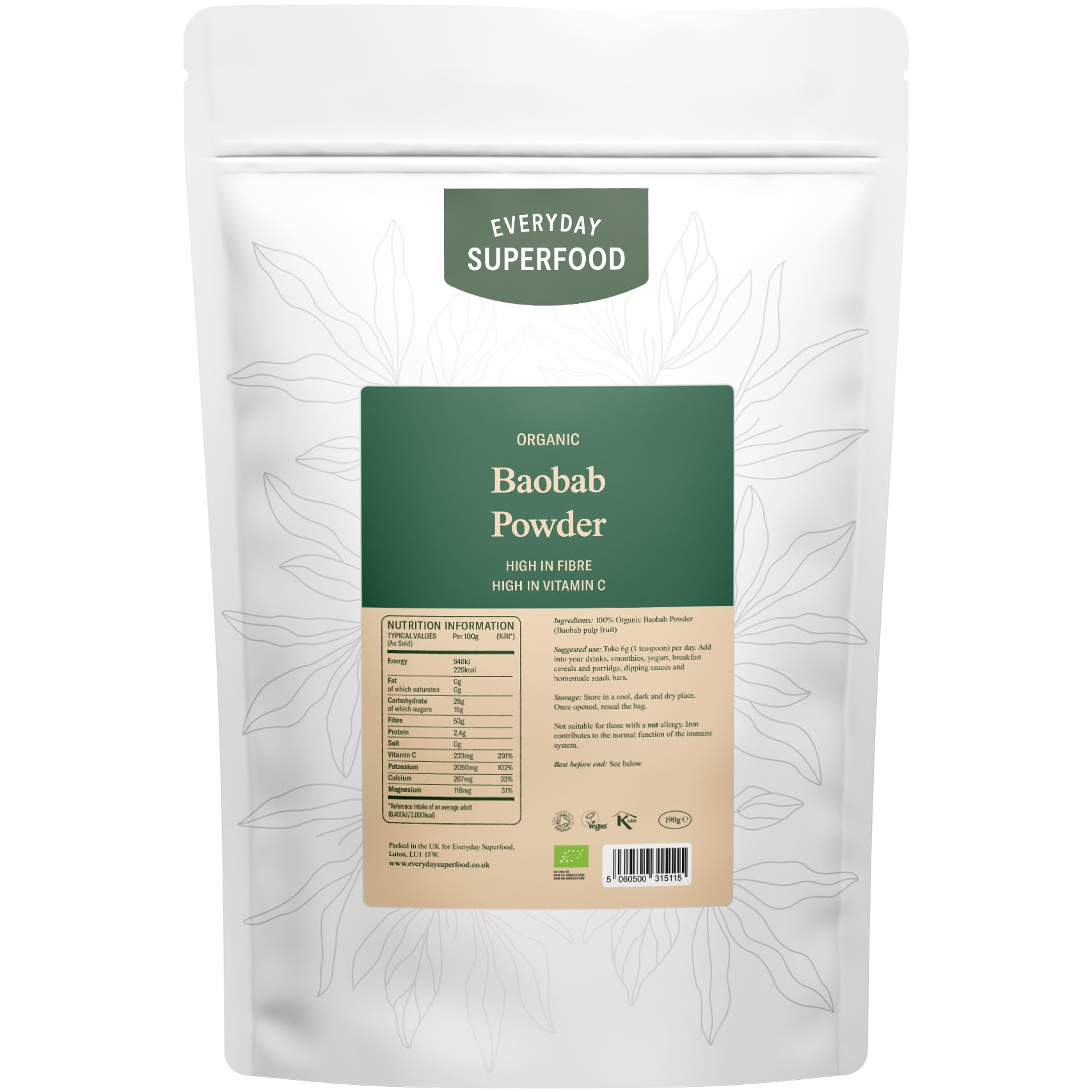 Everyday Superfood Organic Baobab Powder 190g, High Vitamin C, Perfect in Smoothies, Tea and Baking