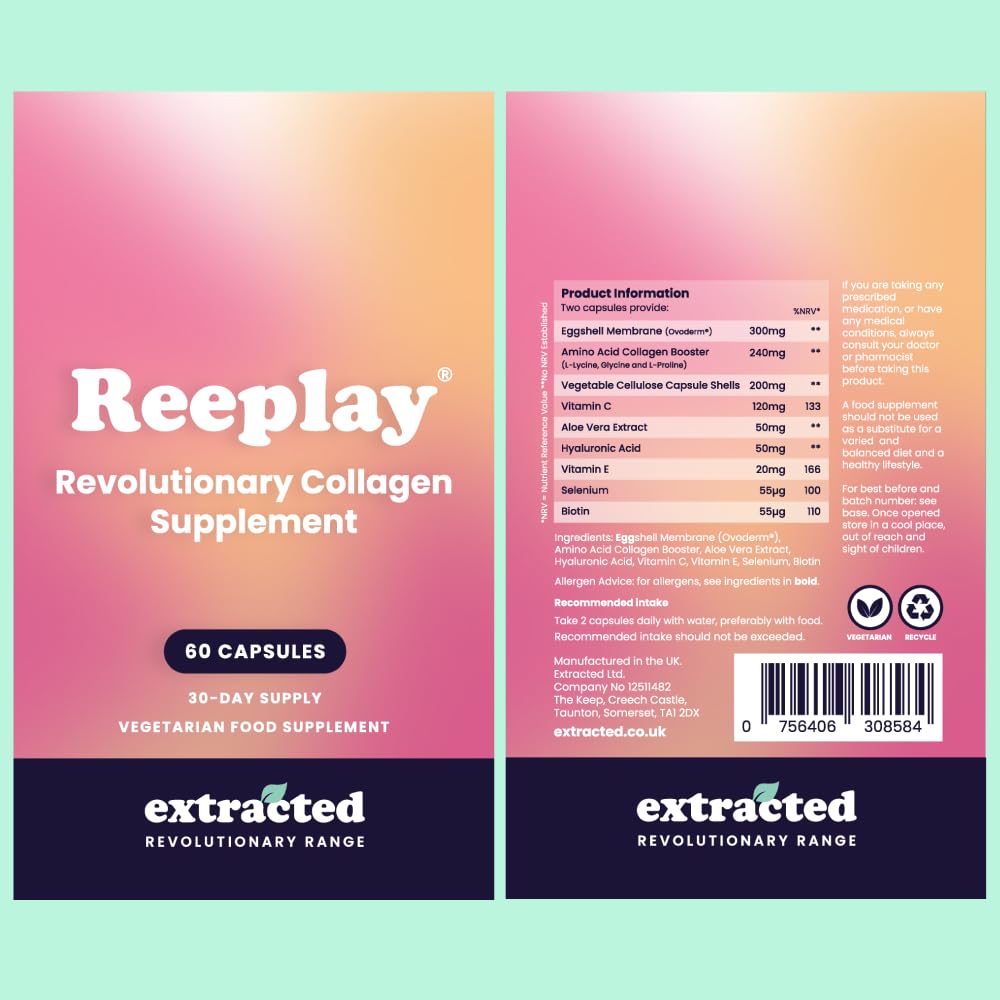 Reeplay by Extracted is a revolutionary collagen supplement designed for those seeking a vegetarian alternative to bovine and marine collagen. Each capsule contains high-strength collagen boosters, including Ovoderm Eggshell Membrane, Hyaluronic Acid, Biotin, and Vitamin C, known for their role in skin hydration, elasticity, and overall radiance. This easy-to-swallow collagen capsule eliminates the need for collagen powder drinks, making it a convenient and taste-free option for daily use. Whether you’re looking to support skin, hair, and nails, or simply enhance your beauty routine, Reeplay offers a powerful collagen formula made in the UK to GMP standards, with no artificial fillers or binders.More Info