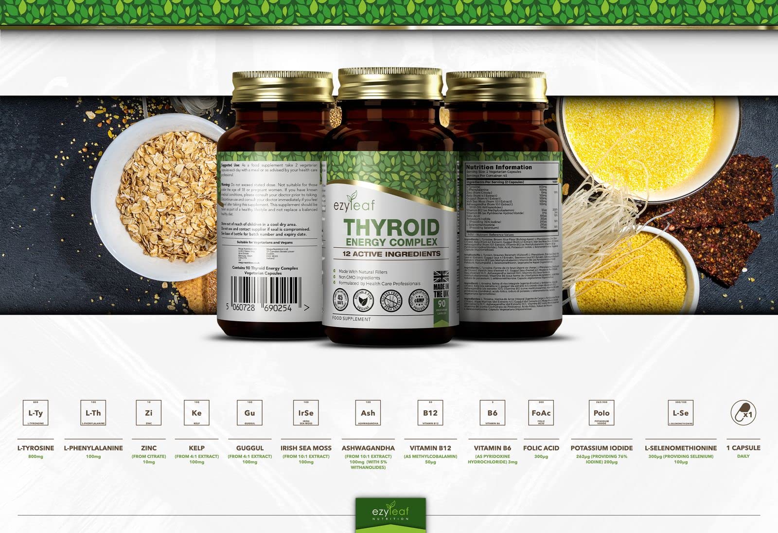 - THE INGREDIENTS - Each serving of 2 capsules provides 800mg of L-Tyrosine, 100mg of L-Phenylalanine, 10mg of elemental Zinc, 100mg of Kelp, 100mg of Guggul, 100mg of Irish Sea Moss, 100mg of Ashwagandha, 50μg of Vitamin B12, 3mg of Vitamin B6, 300μg of Folic Acid, 262μg of Potassium Iodide, and 100μg of Selenium.