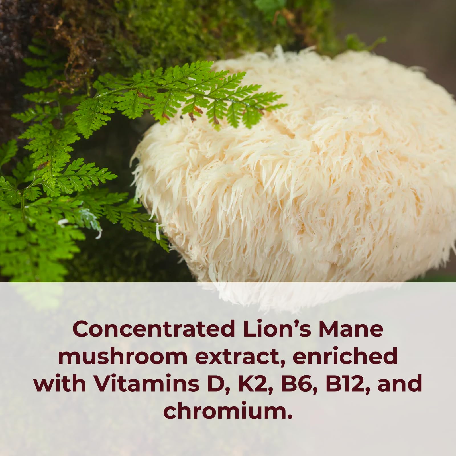 - Seven Power Ingredients: This unique functional mushroom supplement blends Lion's Mane mushroom extract with a potent mix of Vitamins D, K2, B6, B12, and Chromium to support collagen formation for radiant, healthy skin.