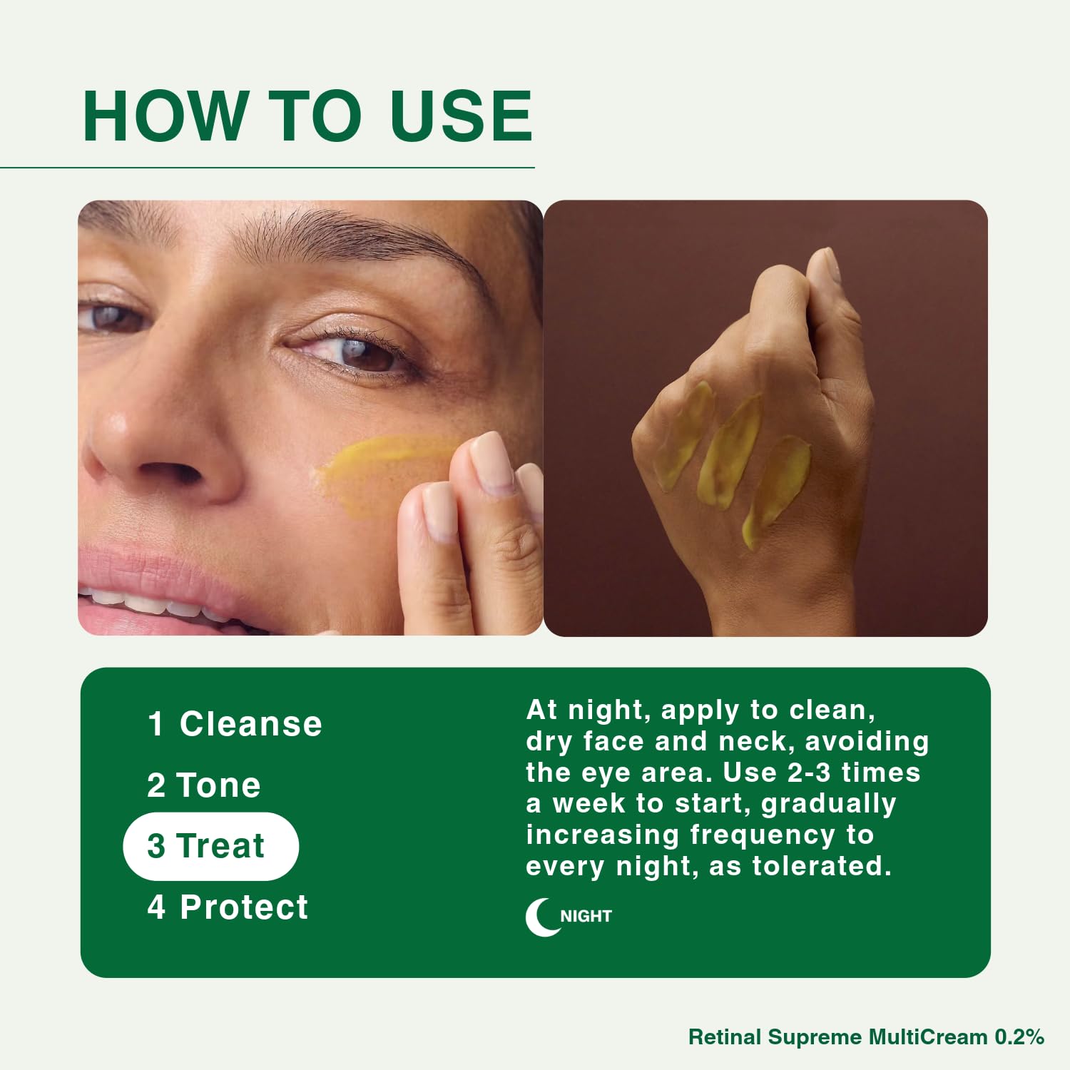 Your Skincare’s Golden Hour is Here Our powerhouse retinal face serum and moisturiser hybrid is a supreme multicream that targets signs of ageing, dullness, pigmentation, uneven-tone and blemishes without the side effects many experience with standard retinol products. This formula works overnight to help you wake up to brighter, firmer skin. We’ve formulated this retinal night cream and serum hybrid with several key benefits. The hybrid night moisturiser promotes firmer, plumper skin. Our Retinal Supreme MultiCream is an all-in-one formula designed for transformative, anti-ageing results by reducing the appearance of fine lines and wrinkles, smoothing uneven texture and promoting a brighter complexion. This scientifically-proven formula is a powerhouse blend of sustained-release retinaldehyde (retinal), Granactive Retinoid, marine bio-retinol, niacinamide, hyaluronic acid and vitamin C. These ingredients work together to firm and plump skin, boost collagen production and leave you brighter, more hydrated skin. Our Supreme MultiCream comes in three different strength options to match your skin needs & Vitamin A experience. We recommend using at least 1 bottle of your current Retinal Supreme MultiCream before moving up in strength to give your skin time to adjust to the formula. This 0.2% strength is only for experienced & advanced Vitamin A users. If you have moved up in strength but find your skin isn't ready to tolerate that, simply store away the higher strength for later (it’s fine to keep open for up to a year after opening) and repeat a bottle of your previous strength to give your skin more time to adjust before you move. With any retinal formula, we recommend using 2-3 times a week to start, then gradually increasing to every night. Listen to your skin and adjust frequency according to how your skin feels. Let dry completely before going to bed to reduce any colour transfer. Vitamin A is not recommended for use while pregnant or breastfeeding. Contents: 1 MultiCream BottleMore Info