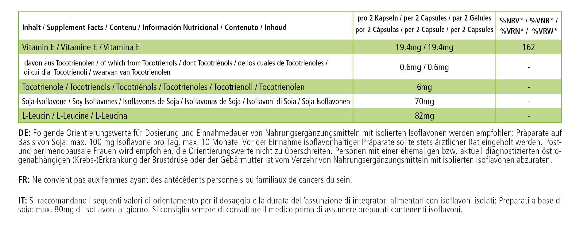 Ingredients: soy protein isolate, emulsifier soy lecithin, glazing agent hydroxypropylmethylcellulose (capsule shell), soy extract (contains 40% isoflavones), L-leucine, bulking agent microcrystalline cellulose, D-alpha-tocopheroyl acetate, cottonseed oil, tocotrienol powder (contains 30% tocotrienols), rice extract blend