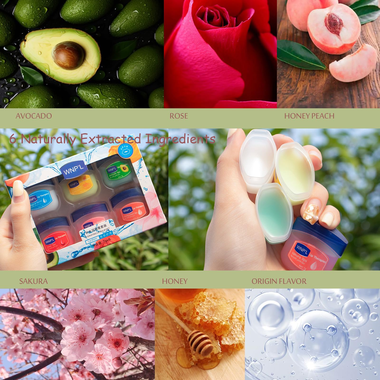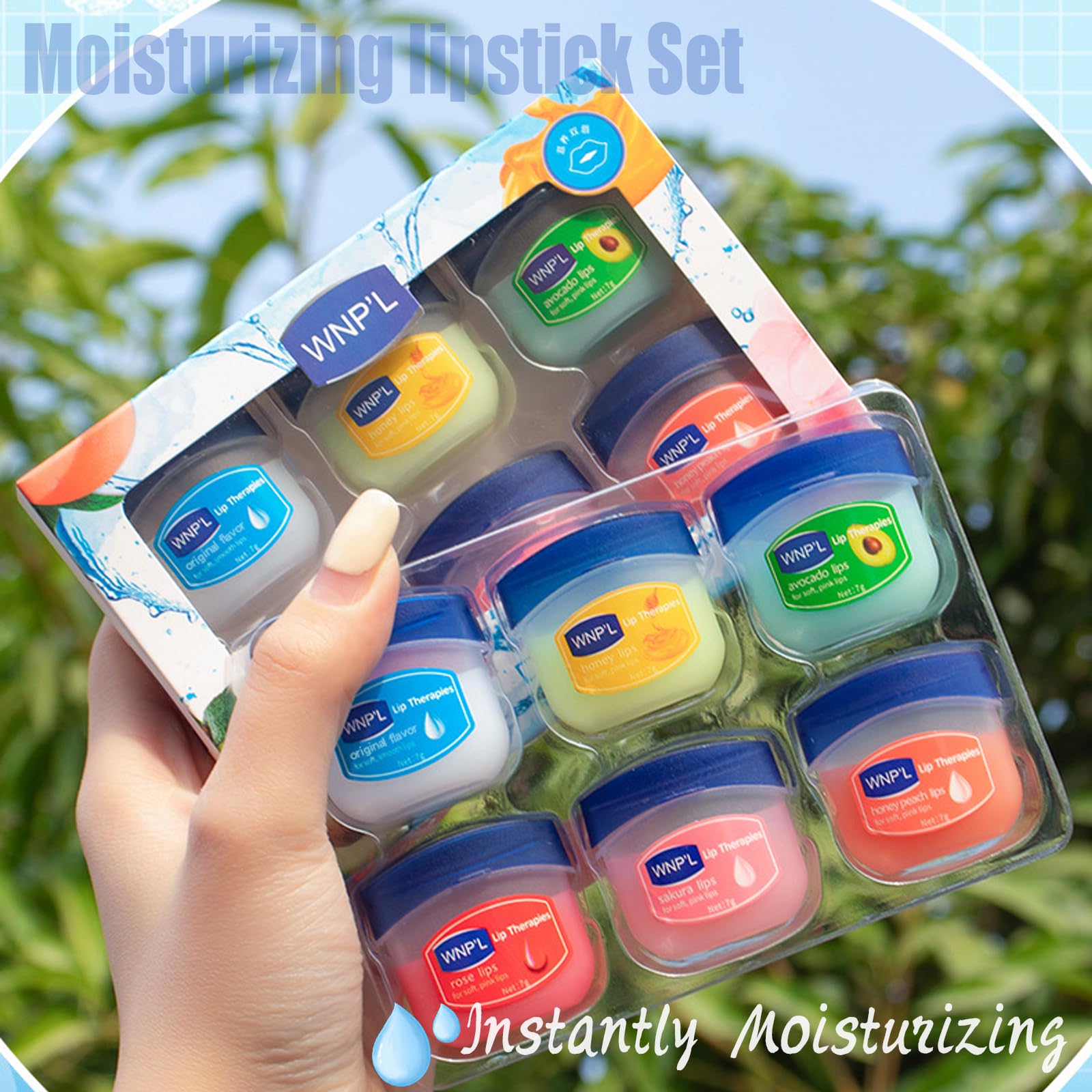 Package Content 6 * lip balms in a gift package Efficacy: Continuously nourish, repair, and replenish moisture to the lip skin, make the lip soft and bright, could be used as daily lip moisturizer, lip primer before applying lip sticks, and deep repairing treatment at night. Ingredient: Vaseline, Petrolatum, Mineral Oil, Ozokerite, Ethylhexyl Palmitate, Beeswax, Caprylic/Capric Triglyceride, Isopropyl Palmitate, Butyrospermum Parkii (Shea) Butter. Usage: Apply an appropriate amount of this product evenly on the lips until it is completely absorbed.More Info