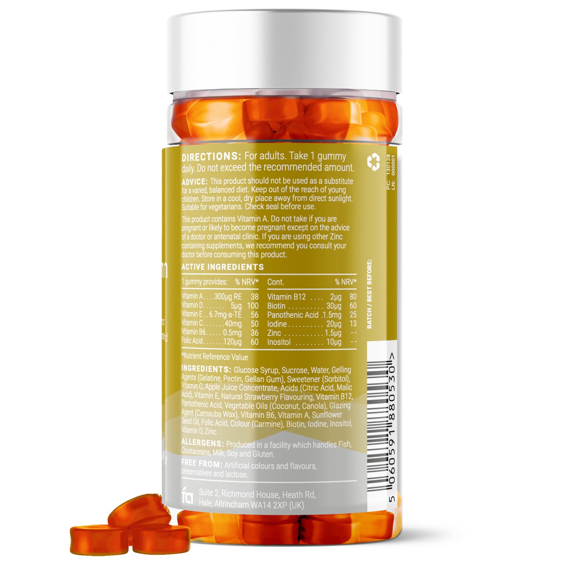 Introducing Feel Amazing's Multivitamin Gummies, a comprehensive blend of 12 essential vitamins and minerals to support your overall health and wellbeing. Packed with important nutrients including Vitamin C, Vitamin E, Pantothenic Acid, Vitamin B6, Vitamin A, Folic Acid, Biotin, Iodine, Vitamin D, Vitamin B12, and Inositol, these gummies are a perfect addition to your daily routine. Each serving is formulated to contribute to normal immune function, energy metabolism, cognitive function, and the reduction of tiredness and fatigue. These key nutrients work together to provide a supportive boost to your health, supporting you to feel your best every day. We understand that taking traditional tablets or capsules can be a challenge for some, which is why we've created these delicious, strawberry-flavoured gummies. They are a delightful and easy way to ensure you're getting a range of essential nutrients every day, all in one convenient gummy. Our gummies are made with the following ingredients: Glucose Syrup, Sucrose, Water, Gelling Agents (Gelatine, Pectin, Gellan Gum), Sweetener (Sorbitol), Vitamin C, Apple Juice Concentrate, Acids (Citric Acid, Malic Acid), Vitamin E, Natural Strawberry Flavouring, Vitamin B12, Pantothenic Acid, Vegetable Oils (Coconut, Canola), Glazing Agent (Carnauba Wax), Vitamin B6, Vitamin A, Sunflower Seed Oil, Folic Acid, Colour (Carmine), Biotin, Iodine, Inositol, Vitamin D, Zinc. Feel Amazing is dedicated to creating high-quality supplements that cater to your health and wellbeing. Our Multivitamin Gummies are halal and free from unnecessary additives, allowing you to trust in the product you're consuming.More Info