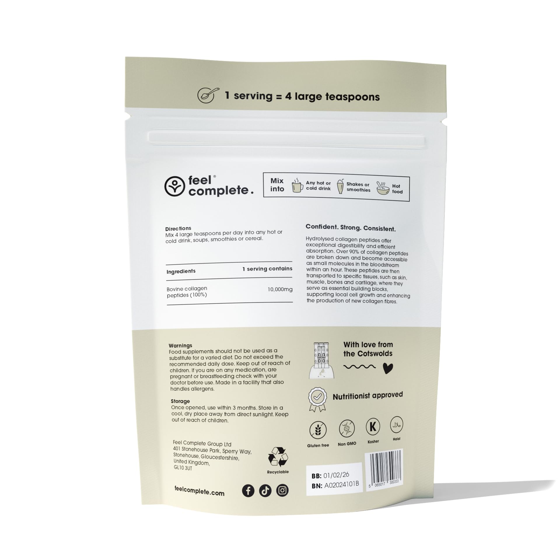 Elevate your well-being and beauty regimen with Feel Complete High Protein Bovine Collagen. Crafted to the highest standards and formulated for maximum efficacy, this supplement is your top choice for all-round wellness. Boasting a 0% fat and 0% sugar formula, whilst only adding 36 calories per serving, it's tailored to flawlessly align with your ketogenic, paleolithic, or low-carbohydrate lifestyle. Quality Guaranteed: Produced under rigorous quality protocols for unparalleled purity and strength. User-Friendly: Simply blend into your morning brew, smoothie, or any dish to suit your palate. UK’s Preferred Choice: A trusted favourite among health and beauty connoisseurs across Britain for its superior results. Key Features High Protein, Minimal Calories: Benefit from substantial health gains at a mere 36 kcal per serving. No Fat, No Sugar: Indulge in guilt-free supplementation—perfect for weight management and suitable for diabetics. Odourless & Tasteless: Easily integrate into your daily diet without altering the flavour or scent of your meals. Nutritional Excellence: Rich in essential amino acids, ideal for muscle recuperation, joint well-being, and overall vitality. Transform your health and beauty routine by incorporating Feel Complete High Protein Bovine Collagen into your day-to-day life. Secure your supply today and experience comprehensive well-being like never before!More Info