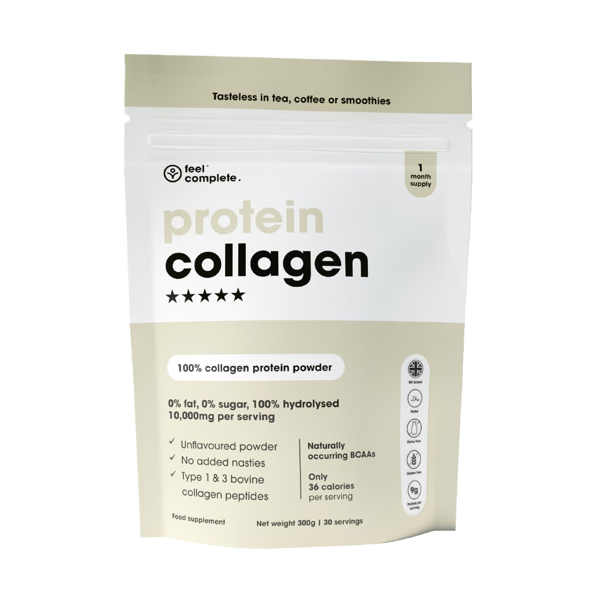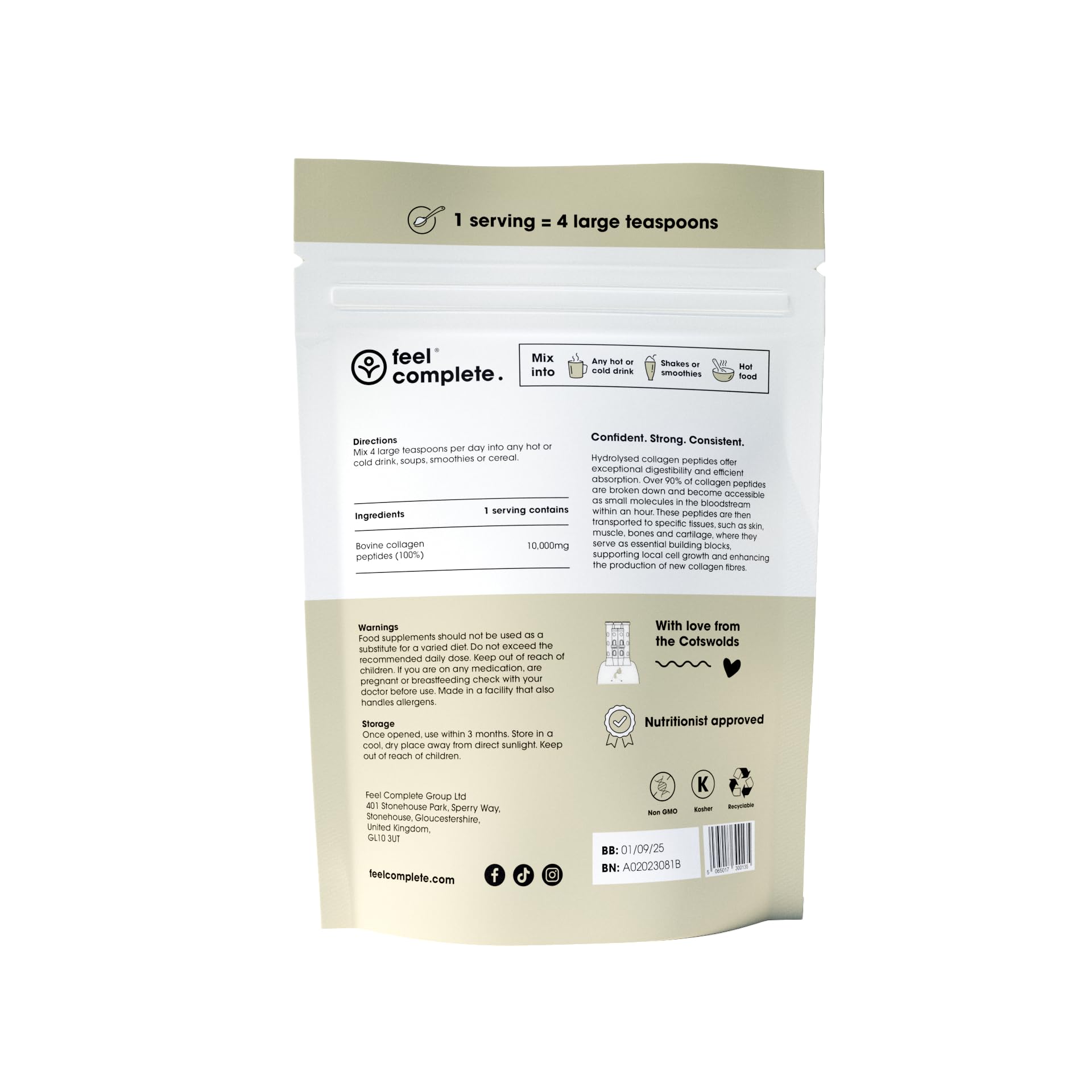 Elevate your well-being and beauty regimen with Feel Complete High Protein Bovine Collagen. Crafted to the highest standards and formulated for maximum efficacy, this supplement is your top choice for all-round wellness. Boasting a 0% fat and 0% sugar formula, whilst only adding 36 calories per serving, it's tailored to flawlessly align with your ketogenic, paleolithic, or low-carbohydrate lifestyle. Quality Guaranteed: Produced under rigorous quality protocols for unparalleled purity and strength. User-Friendly: Simply blend into your morning brew, smoothie, or any dish to suit your palate. UK’s Preferred Choice: A trusted favourite among health and beauty connoisseurs across Britain for its superior results. Key Features High Protein, Minimal Calories: Benefit from substantial health gains at a mere 36 kcal per serving. No Fat, No Sugar: Indulge in guilt-free supplementation—perfect for weight management and suitable for diabetics. Odourless & Tasteless: Easily integrate into your daily diet without altering the flavour or scent of your meals. Nutritional Excellence: Rich in essential amino acids, ideal for muscle recuperation, joint well-being, and overall vitality. Transform your health and beauty routine by incorporating Feel Complete High Protein Bovine Collagen into your day-to-day life. Secure your supply today and experience comprehensive well-being like never before!More Info