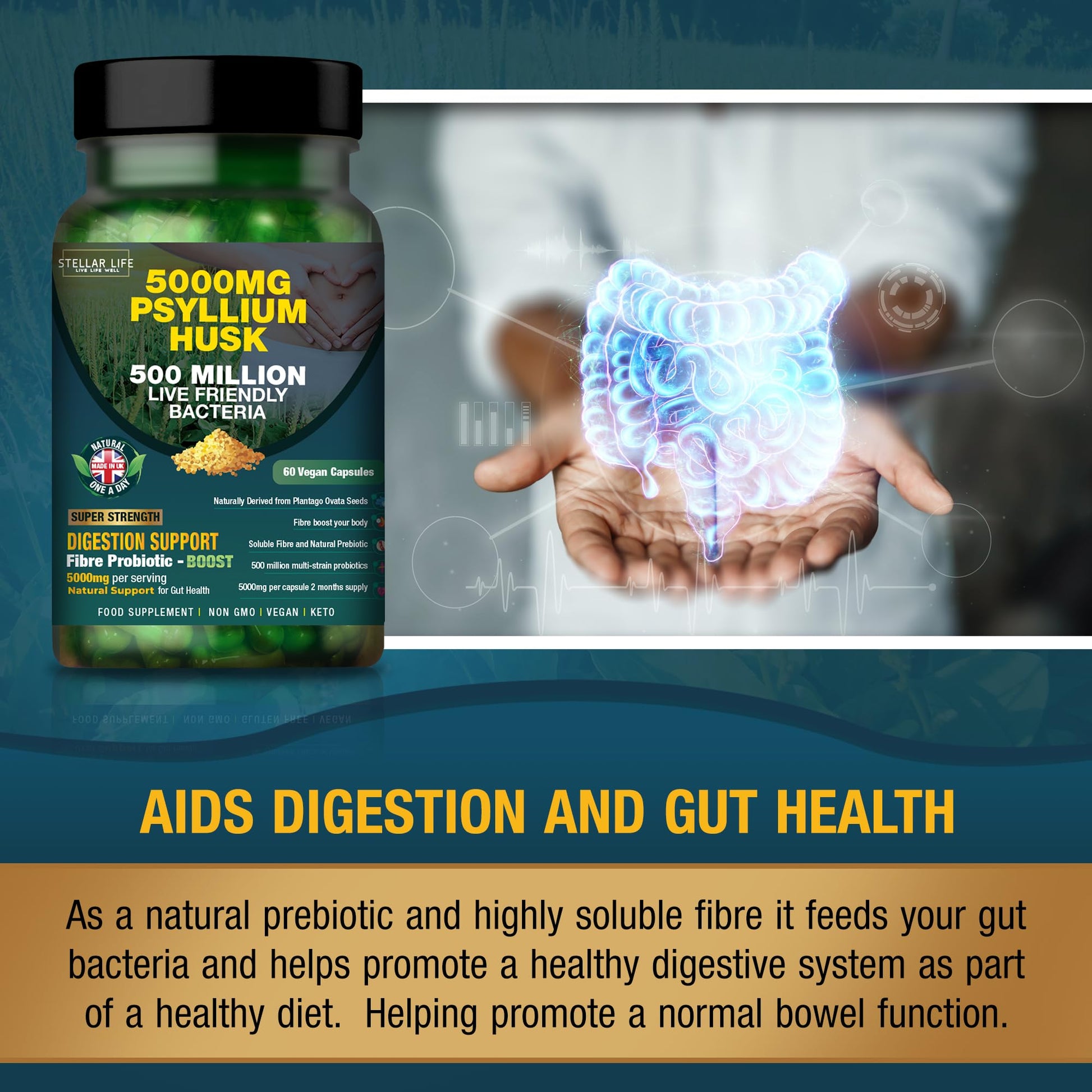 Fibre Supplement 5000mg Psyllium Husk with 500 Million Multi-Strain Probiotic - High Strength - Natural Soluble Fiber Supplement Plantago Ovata Seeds 2 Month Supply Psyllium Husks Capsules Vegan, UK