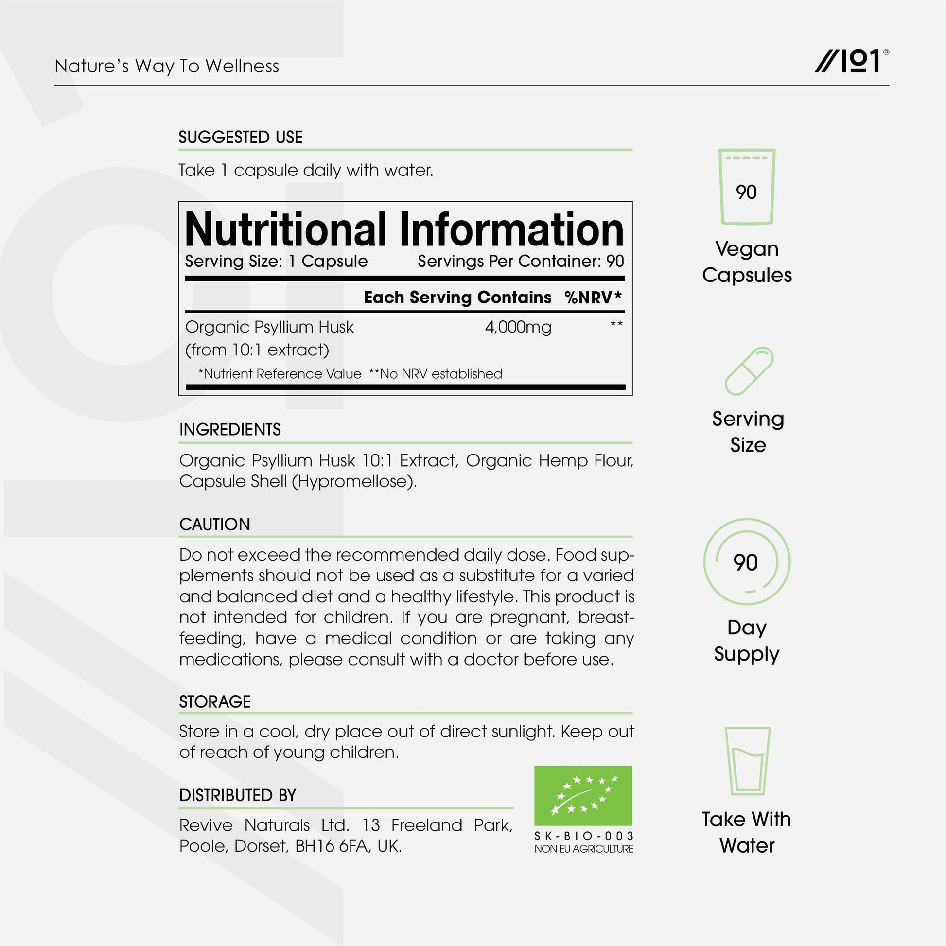 Fibre Supplement Organic Psyllium Husk 4000mg - Natural Prebiotic Fibre Supplement from Raw Plantago Ovata Seeds - Resealable and Recyclable Pouch - 90 Vegan Capsules - by Alpha01