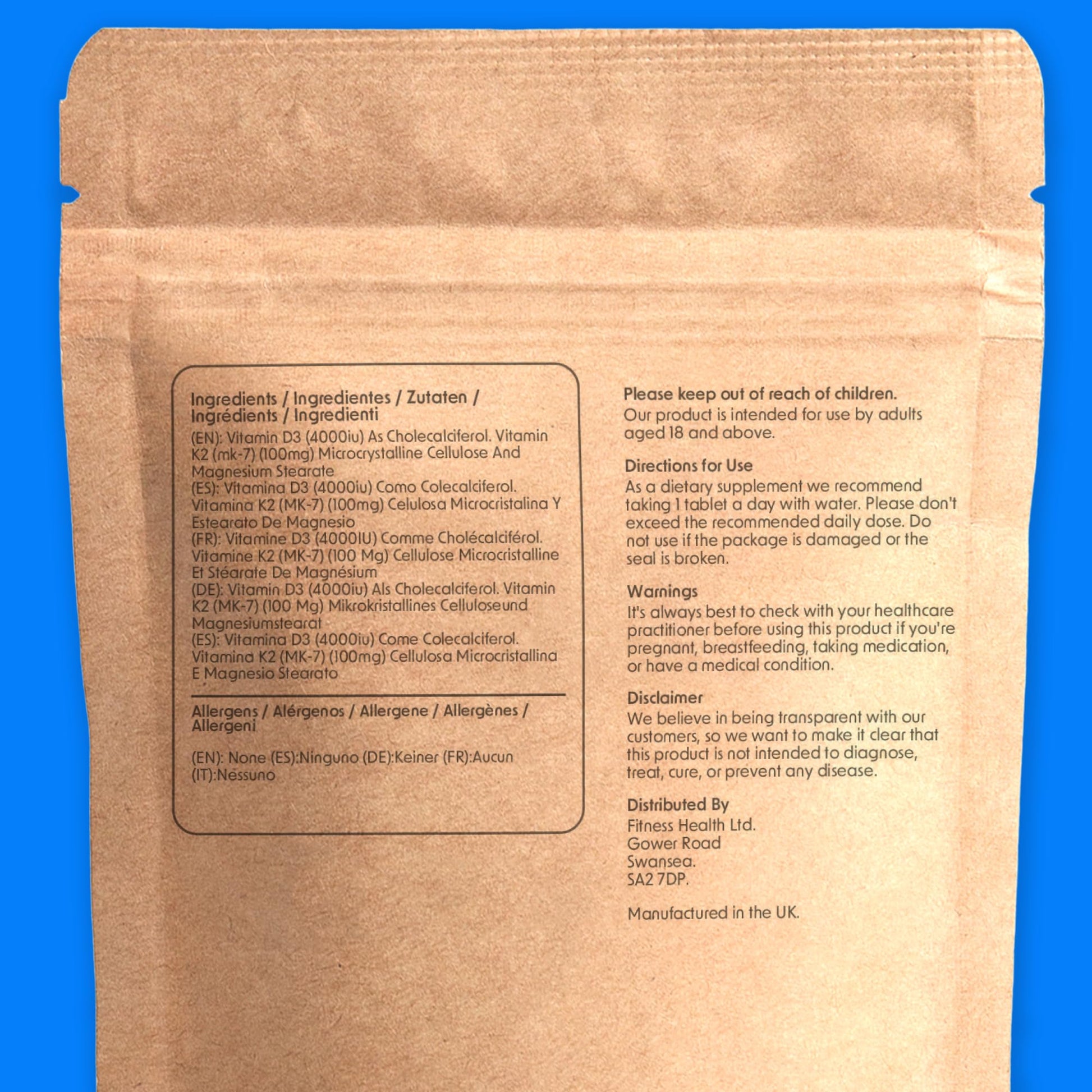 Fitness Health Vitamin D3 K2 (MK7) Tablets contain vitamin d3 (4000iu) as cholecalciferol. Vitamin k2 (mk-7) (100mg) Microcrystalline cellulose and magnesium stearate are delivered in a convenient and easy-to-swallow tablet form with no added preservatives or harmful ingredients.