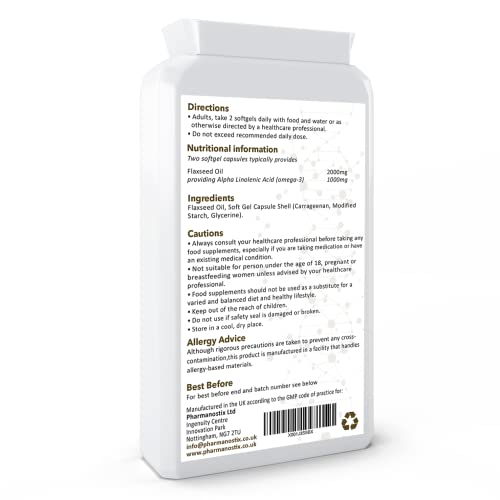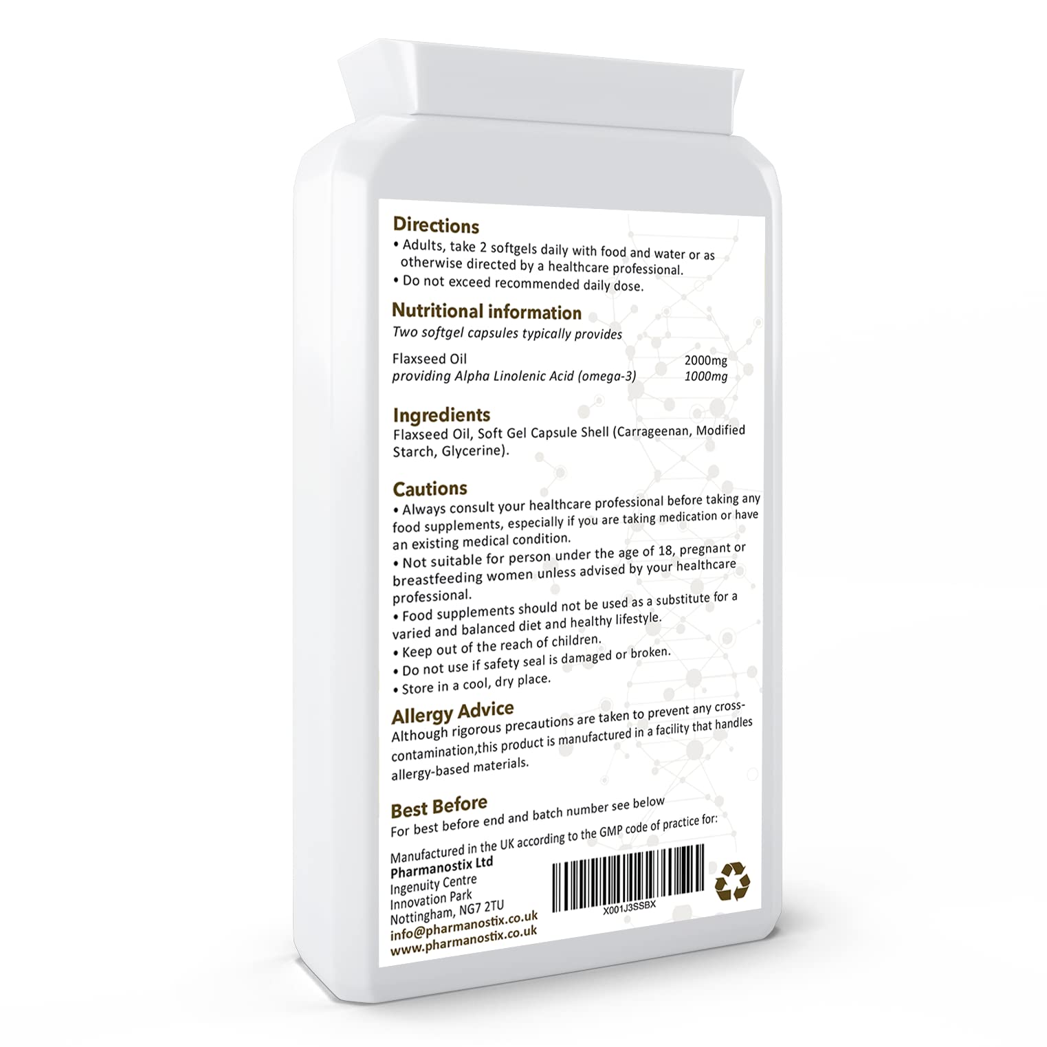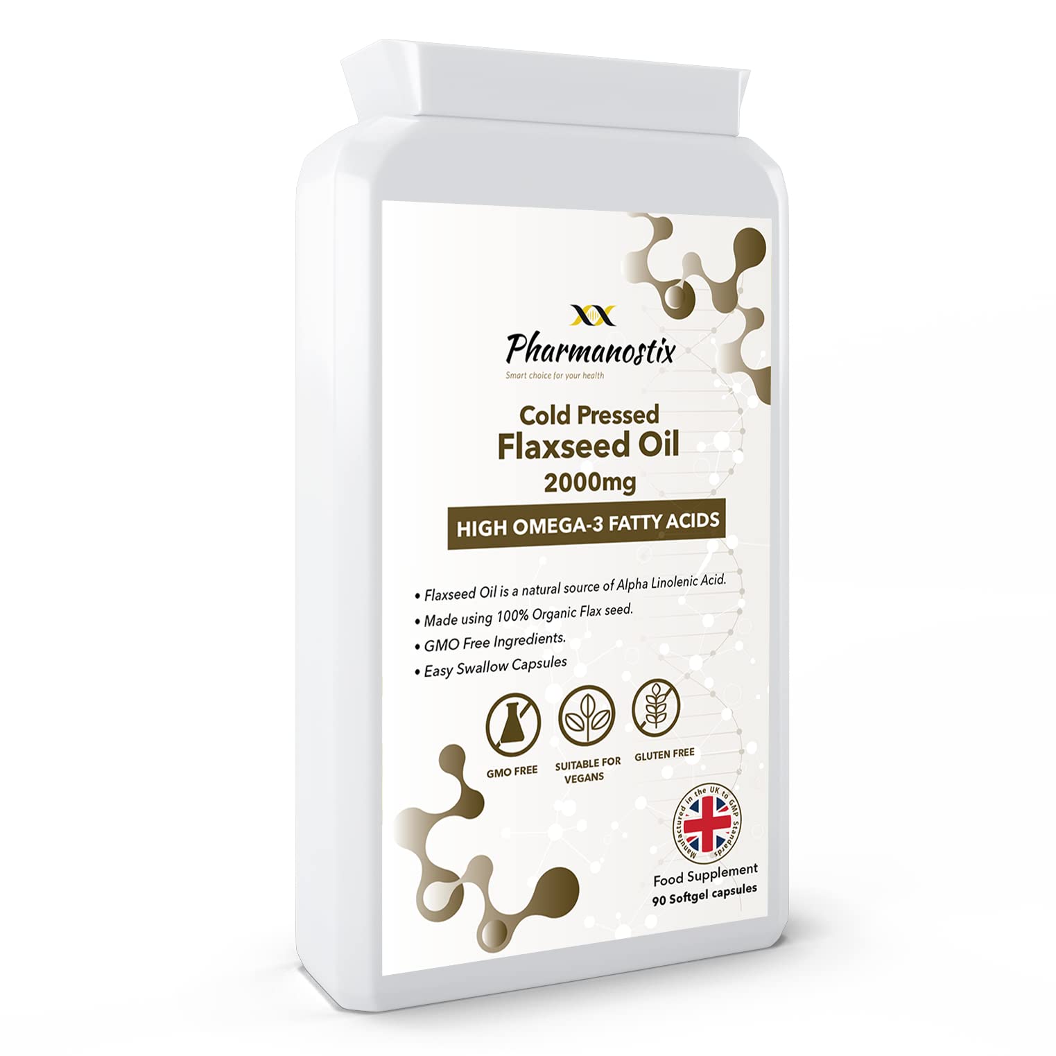 Flaxseed Oil Supplement 2000mg Daily Dosage - 90 Easy Swallow Vegan Capsules - Potent Source of Omega 3 Fatty Acids Including Alpha Linolenic Acid- High Strength - UK Manufactured by Pharmanostix