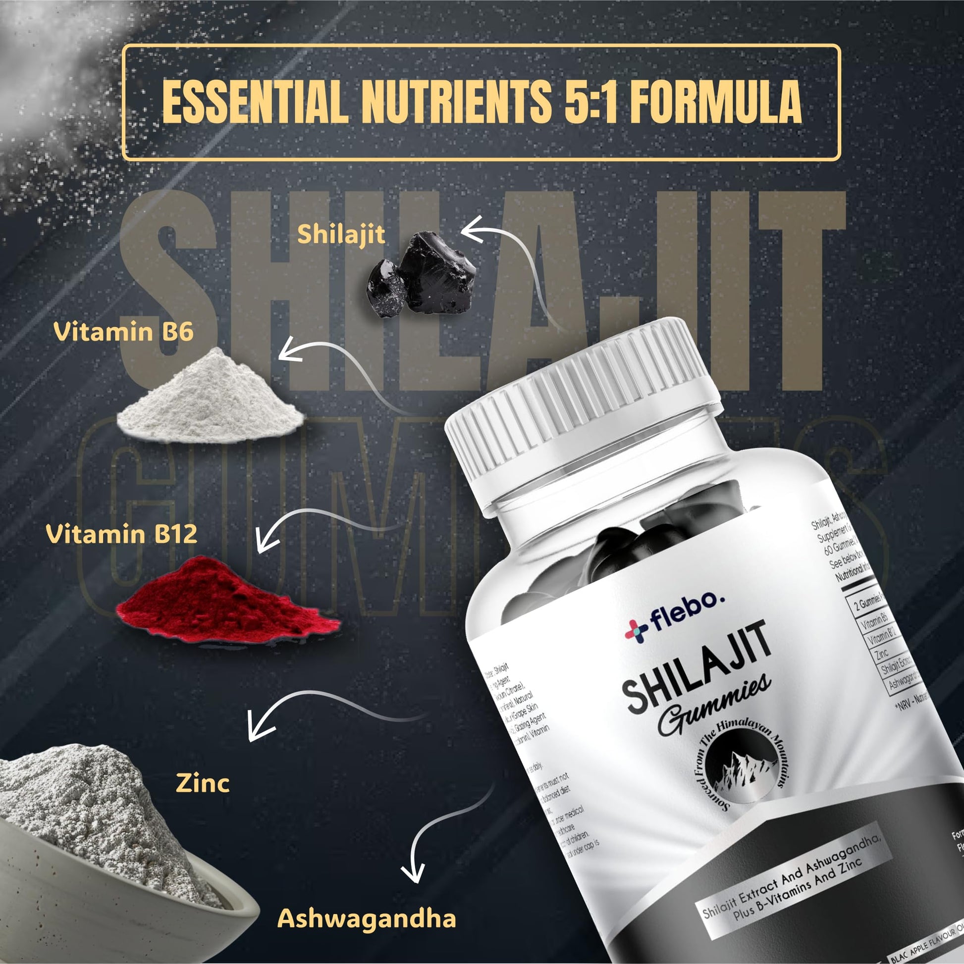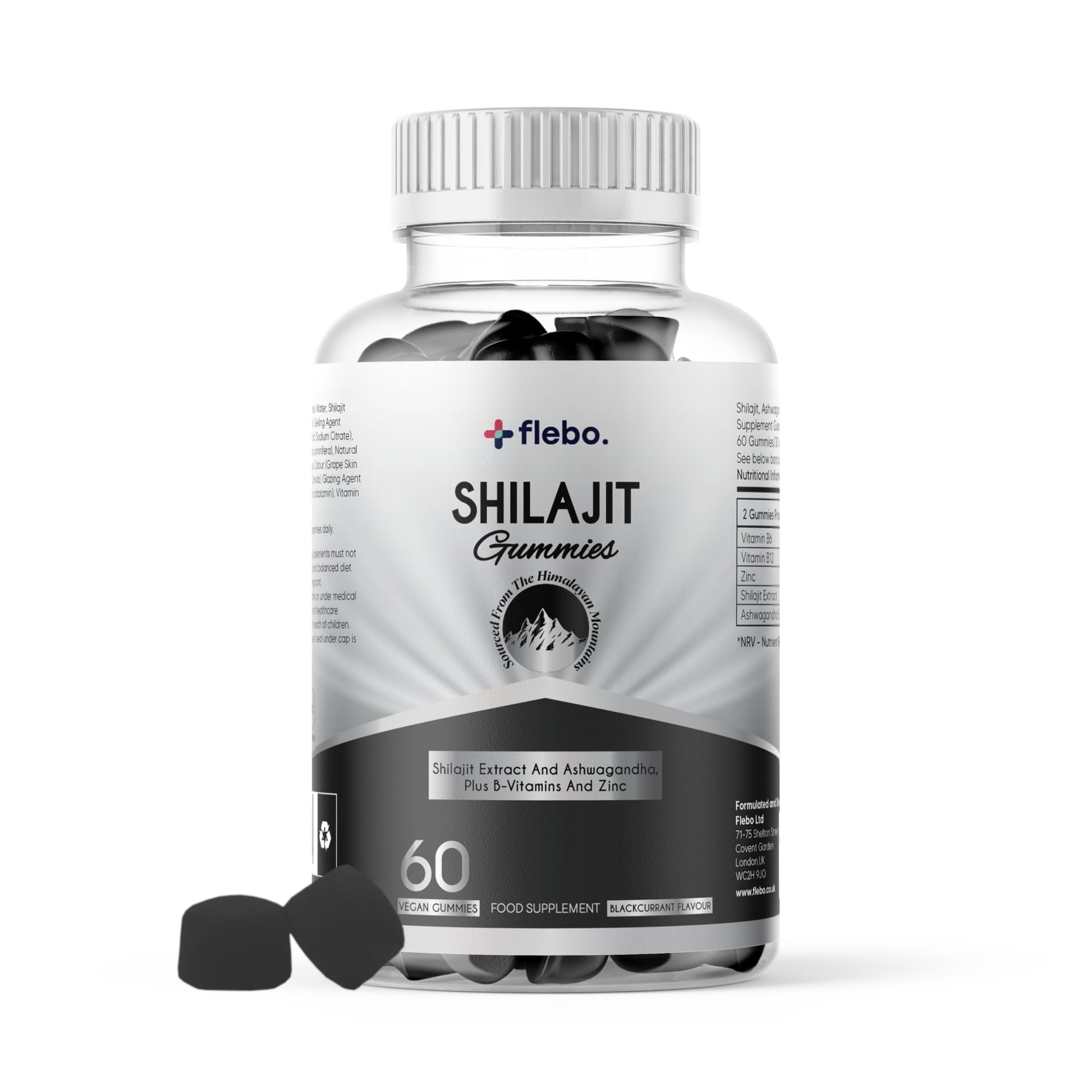 Flebo Pure Himalayan Shilajit Gummies - Formulated with Ashwagandha and Zinc- 50% Fulvic Acid- 60 Two A Day Blackcurrant Flavour- Energy, Stress Relief and Immune Support. Vegan and Halal