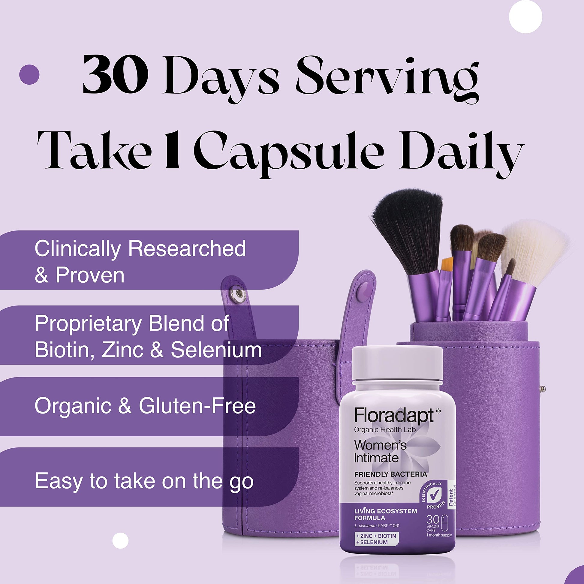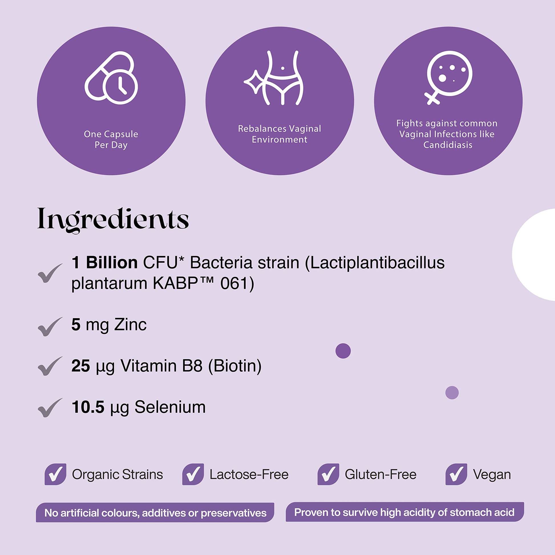 A healthy vaginal environment is composed of many types of bacteria in a balanced, harmonic way (vaginal microbiota). When the vaginal environment is altered, there is an increased susceptibility to infections, including Candidiasis, the most common vaginal infection. The ingredients in Women's Intimate work by: Balancing the vaginal environment: Women’s intimate bacteria strains adhere and grow within the vaginal environment, promoting a low ph that keeps bad microbes away. Antimicrobial activity: Women’s Intimate strain produces molecules that help eliminate pathogens including Candida albicans. Plus, Zinc and Selenium boost the immune response to prevent infection. Supporting a healthy vaginal wall: Biotin contributes to the maintenance of normal mucous membranes. A strong vaginal wall is a first-line defense against infection.More Info