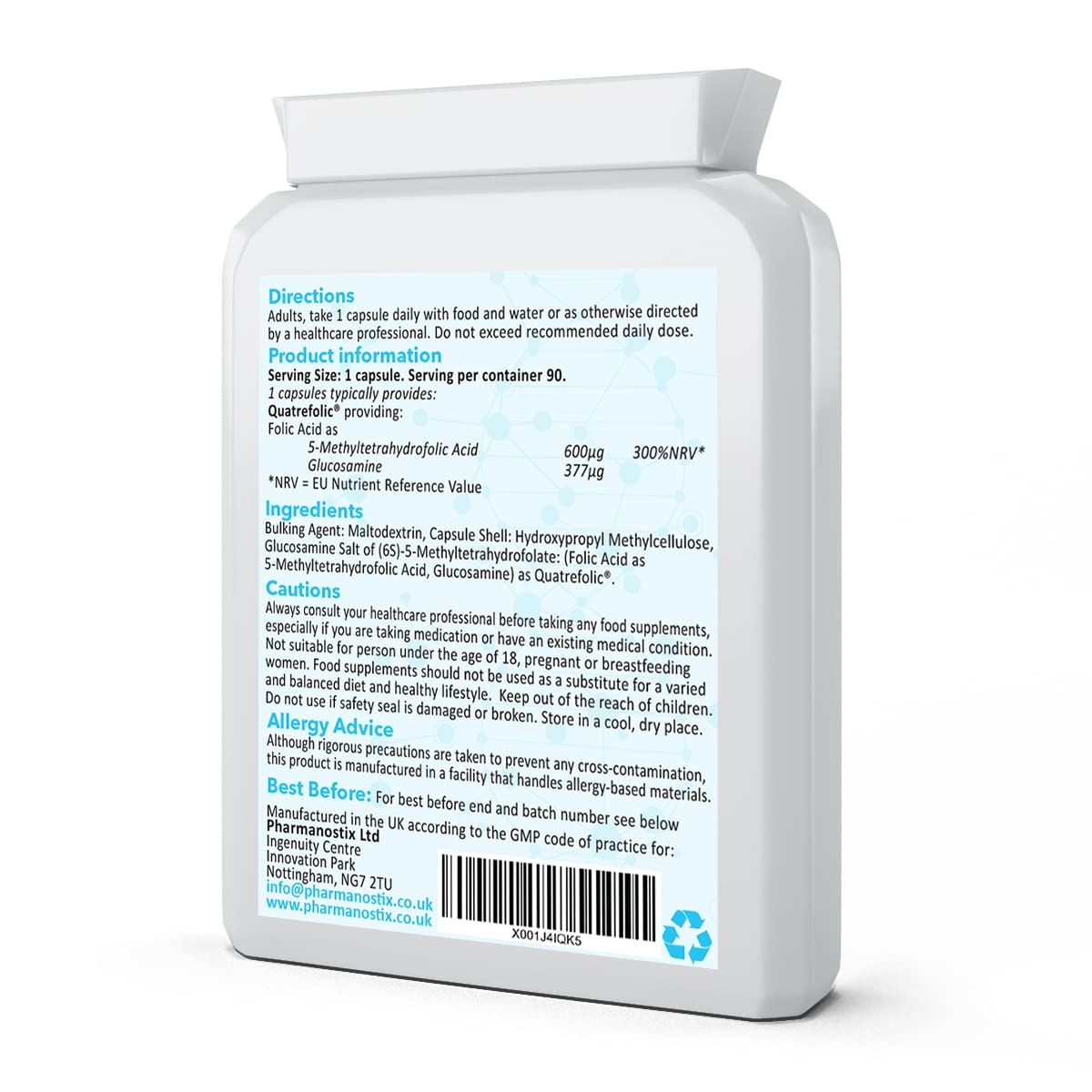 Folic Acid Methyl Folate Quatrefolic 600µg 90 Capsules. Food Supplement with Quatrefolic, a blend of 5-Methyltetrahydrofolic Acid & Glucosamine. Quatrefolic is a new source of folate. It is a glucosamine salt of (6S)-5-methyltetrahydrofolate, the active form of folate naturally present in the body and immediately able to penetrate the blood and the cell membrane without further metabolism. Quatrefolic represents an innovative dietary ingredient designed to act as a nutrient in all areas where folic acid and folate supplementation has been recommended and allowed. It is highly bioavailable. In recent years evidence has shown the advantages of reduced folate vs folic acid. The rational use of such reduced folates (particularly reduced and methylated) is derived from the inability of a part of World’s population to assimilate and metabolize folic acid from food or supplements. Quatrefolic is able to immediately provide the essential form used and stored in the human body, without any risk for human health and being completely independent to any metabolic transformation. Folate contributes to: maternal tissue growth during pregnancy normal amino acid synthesis normal blood formation normal homocysteine metabolism normal psychological function normal function of the immune system reduction of tiredness and fatigue Folate also has a role in the process of cell division. Manufactured in the UK to GMP code of practice and supplied in innovative letterbox friendly and recyclable packaging.More Info