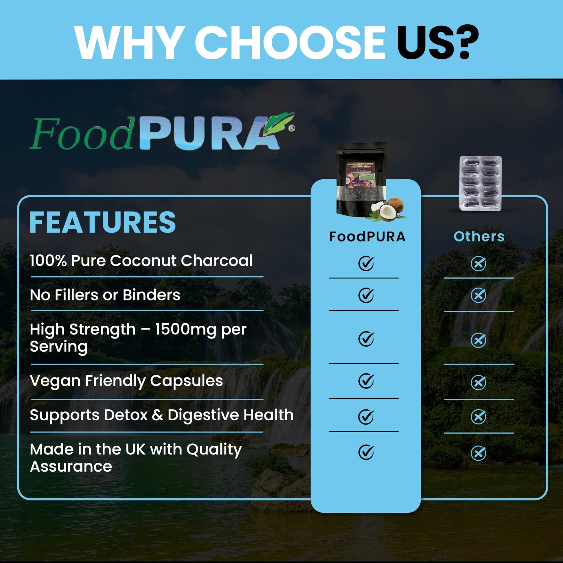 FoodPURA 100% Pure & Natural Coconut Activated Charcoal Capsules provide 1500mg per serving. There are NO chemicals used in the production of our activated charcoal as it is Steam Activated Non GMO, Dairy, Lactose, Soya, Gluten, Wheat, Additive, Preservatives, Binders & Fillers Free. Vegan & Vegetarian friendly CapsulesMore Info