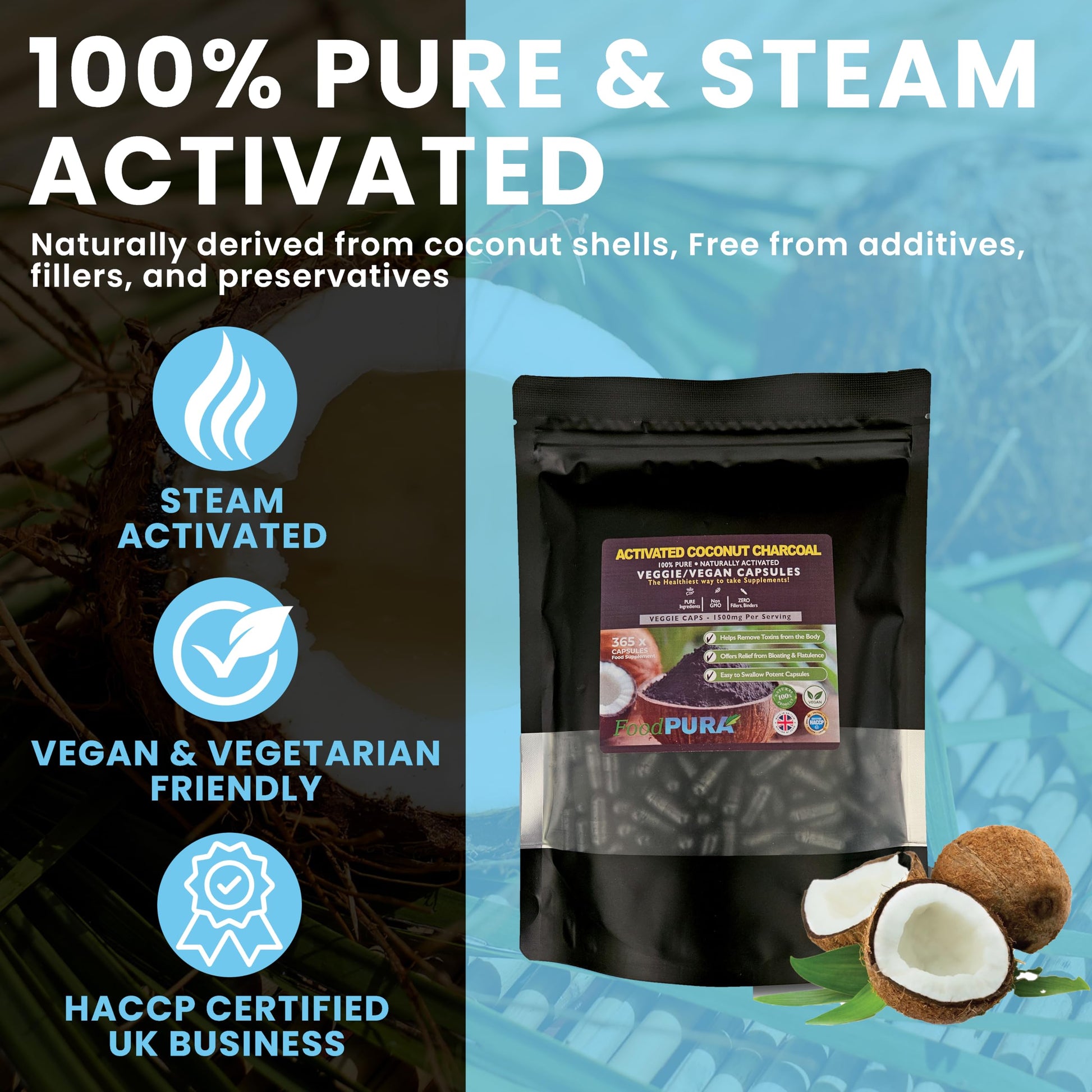 FoodPURA Coconut Activated Charcoal Capsules 1500mg x 365 100% Natural Vegan Digestive Supplement Reduces Bloating & Flatulence After Eating (365)