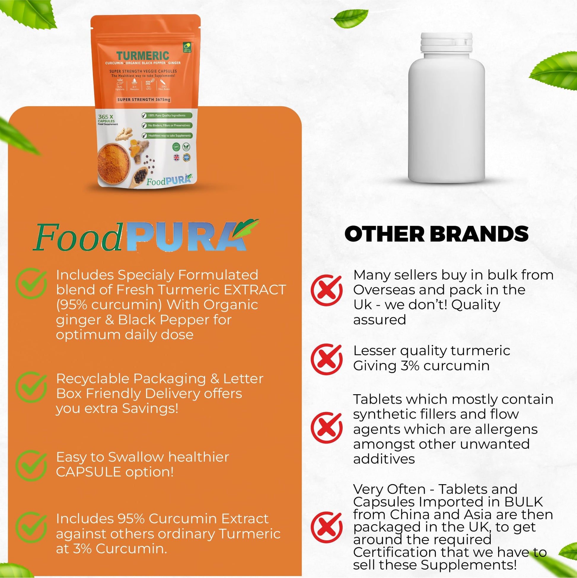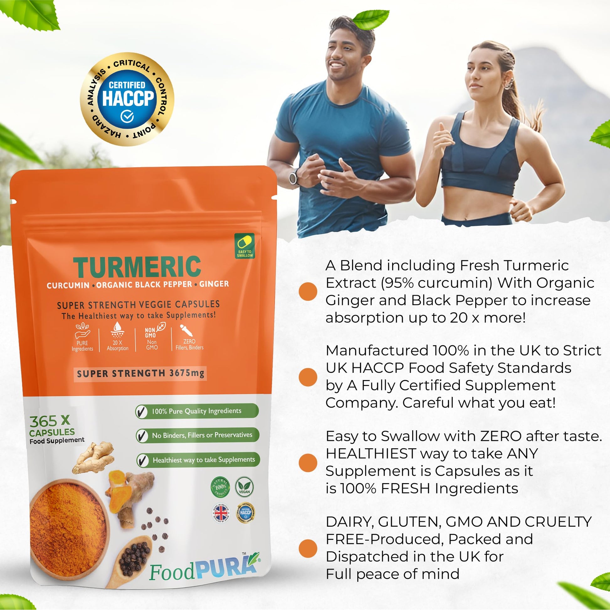FoodPURA Turmeric Curcumin Capsules with Black Pepper & Ginger High Strength 3675mg HACCP Certified, Manufactured in The UK by FoodPURA (365)
