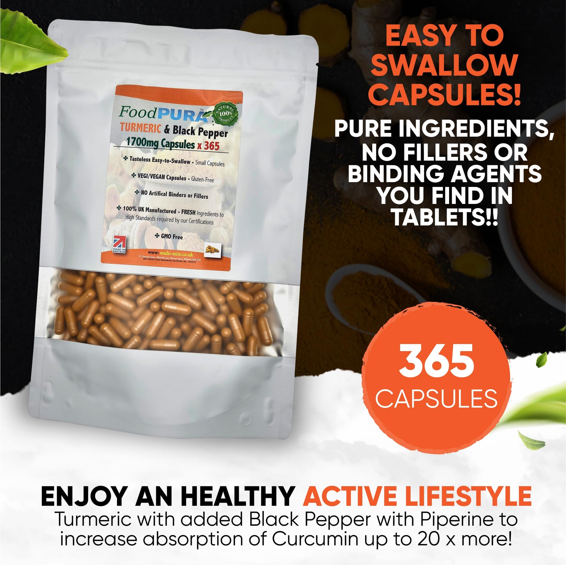FoodPURA Turmeric with Black Pepper Capsules High Strength 1700mg HACCP Certified, Manufactured in The UK by FoodPURA 1 Pack of 365 Capsules … …
