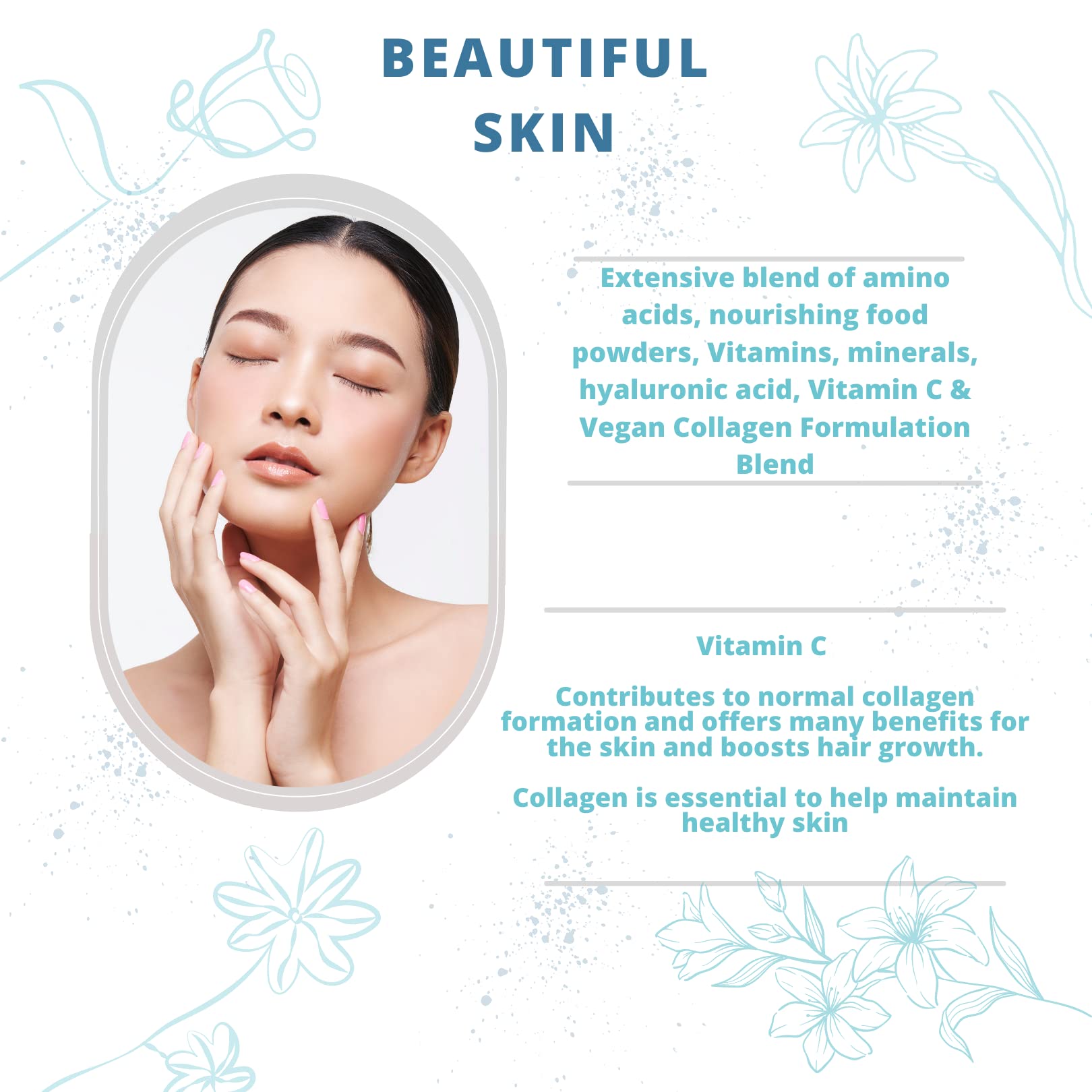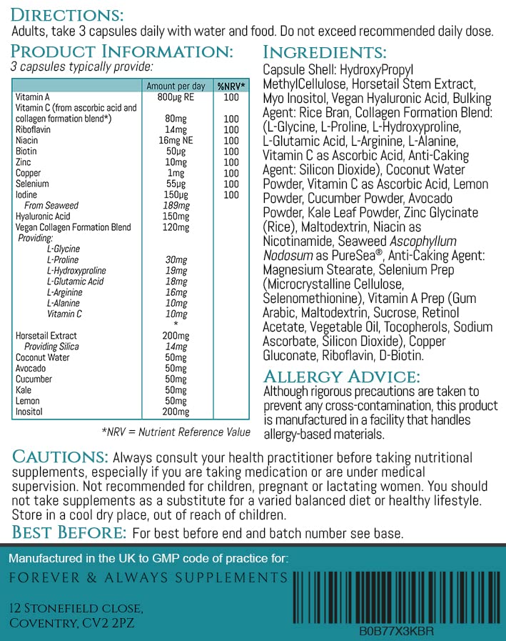 Forever & Always Vegan Biotin Hair skin and Nails Vitamins - The ultimate skin hair and nails vitamins for women and men containing an extensive blend of amino acids, nourishing food powder, vitamins, minerals, hyaluronic acid, vitamin C & Vegan Collagen. 🍂 90 x hair and nails vitamins to assist with hair growth, strong nails and beautiful skin will provide a months daily supply. Ingredients - 3 capsules typically provides: Vitamin A 800µg RE (100% NRV) Vitamin C (from ascorbic acid and collagen formation blend*) 80mg (100% NRV) Riboflavin 1.4mg (100% NRV) Niacin 16mg NE (100% NRV) Biotin 50µg (100% NRV) Zinc 10mg (100% NRV) Copper 1mg (100% NRV) Selenium 55µg (100% NRV) Iodine 150µg (100% NRV) - from Seaweed 15mg Hyaluronic Acid 150mg Vegan Collagen Formation Blend 120mg, Providing: - L-Glycine 30mg - L-Proline 19mg - L-Hydroxyproline 18mg - L-Glutamic Acid 16mg - L-Arginine 10mg - L-Alanine 10mg - Vitamin C Horsetail extract 200mg - Providing silica 14mg Coconut Water 50mg Avocado 50mg Cucumber 50mg Kale 50mg Lemon 50mg Inositol 200mg *NRV=Nutrient Reference Value Allergy Advice: Please see potential allergens in the ‘Ingredients’ in bold. Although rigorous precautions are taken to prevent any cross-contamination, this product is manufactured in a facility that handles allergy-based materials. Traces of Molluscs, Crustacean and/or Fish may be present due to seaweed harvesting methods. Cautions Always consult your health practitioner before taking nutritional supplements, especially if you are taking medication or are under medical supervision. Not recommended for children, pregnant or lactating women. You should not take supplements as a substitute for a varied balanced diet or healthy lifestyle. Store in a cool dry place, out of reach of children.More Info