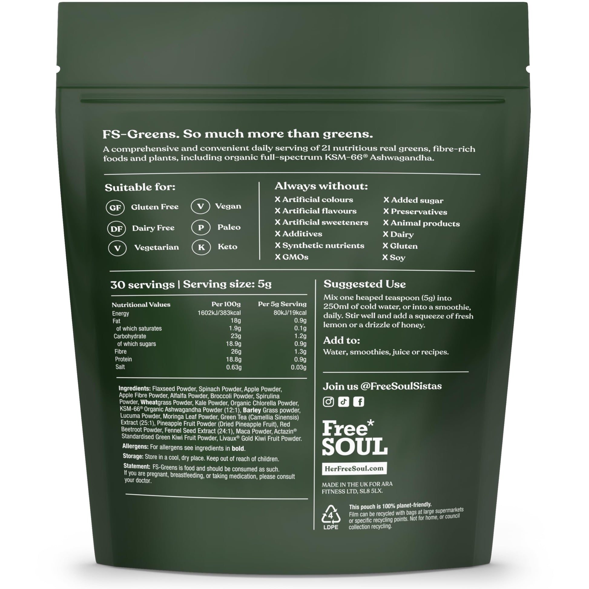 21 natural and nutrient-dense greens, superfoods and adaptogens in one convenient daily serving. Enjoy one teaspoon with 250 ml of water to support your body and feel your best. FS-Greens offers the benefits of 21 different foods in one simple daily drink. Comprehensive Nutrition: A single, clean, plant-based blend with 21 active ingredients designed to support digestion, boost immunity and give your body the green goodness it needs with FS-Greens powder. Digestion Support: Supports your digestive health and microbiome with naturally occurring enzymes from nutrient dense clean ingredients. No added sugars, artificial sweeteners, flavourings, fillers or dairy - for bloat-free digestion. Versatile and Convenient: One simple and easy-to-use blend to boost your daily intake of greens. Enjoy one scoop with water or supercharge your Free Soul Protein Smoothies for an all-round wellness boost. Key ingredients such as KSM-66 Ashwagandha and Golden Kiwi have been added to naturally support hormones, improve digestion and reducing bloating. The Key Ingredients include KSM-66 Ashwagandha: The highest grade of Ashwagandha on the planet. Actazin & Livaux Golden Kiwi: Exclusively harvested in New Zealand to benefit digestion. Lucuma: Rich in antioxidants a range of flavonoids. Organic Chlorella: Contains a wide range of antioxidants and carotenoids, including beta-carotene and lutein. Let your nutrition bloom with clean green & superfood ingredients. Includes Spirulina, Alfalfa, Wheatgrass, Maca, Beetroot, Pineapple, Broccoli, Kale, Barley, Flaxseed, Fennel Seed, Moringa, Green Tea, & Apple Fibre.More Info