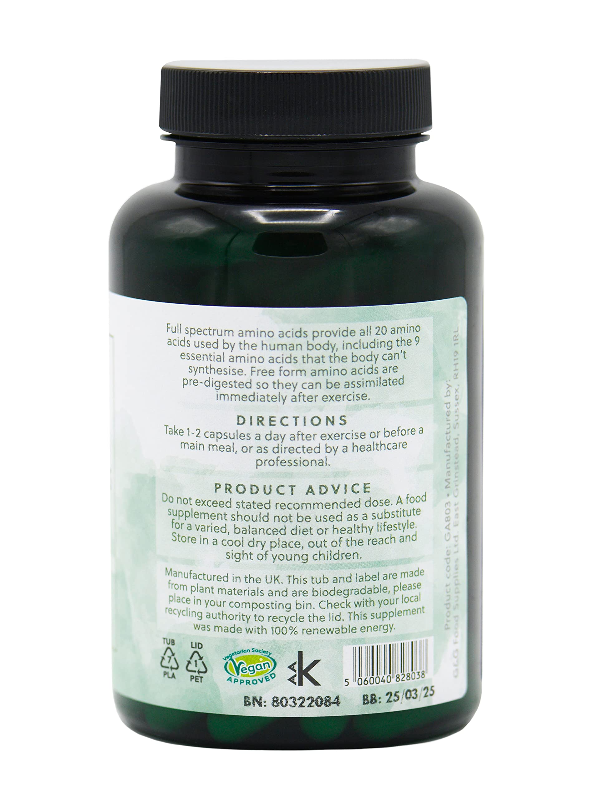 Full Spectrum Amino Acids Capsules | BCAA | Free Form Amino Acids | 120 Vegan Capsules | G&G Vitamins- 120 Capsules