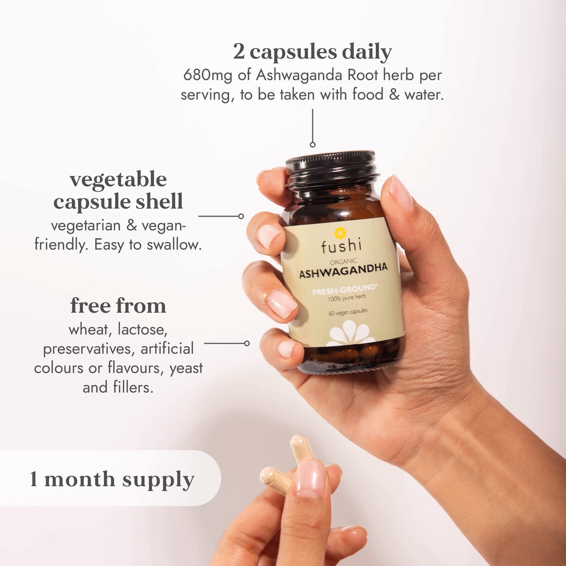 Fushi Ashwagandha Organic Herbal Supplement 340 mg, 60 Caps | Fresh-Ground Wholefood | Adaptogen, Immune, and Energy | Ethical & Vegan | Ayurveda Formula Known as WithaniaSomnifera