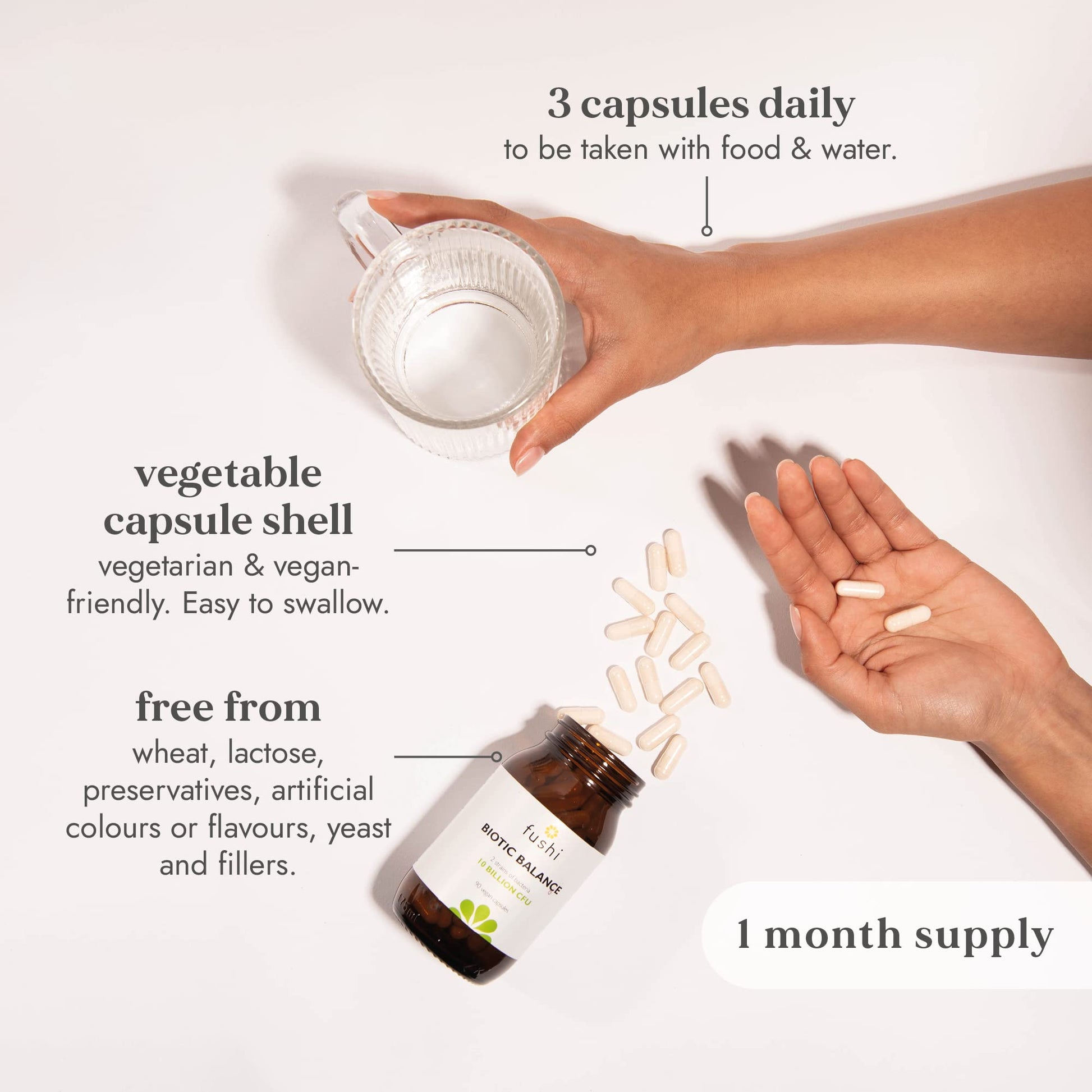 Fushi Biotic Vegan Balance 10 bn cfu Capsules, 90 Caps |Rich in Multi-Strain & Vitamin C | Contains FOS | for Vegetarians & Vegans | Made in The UK