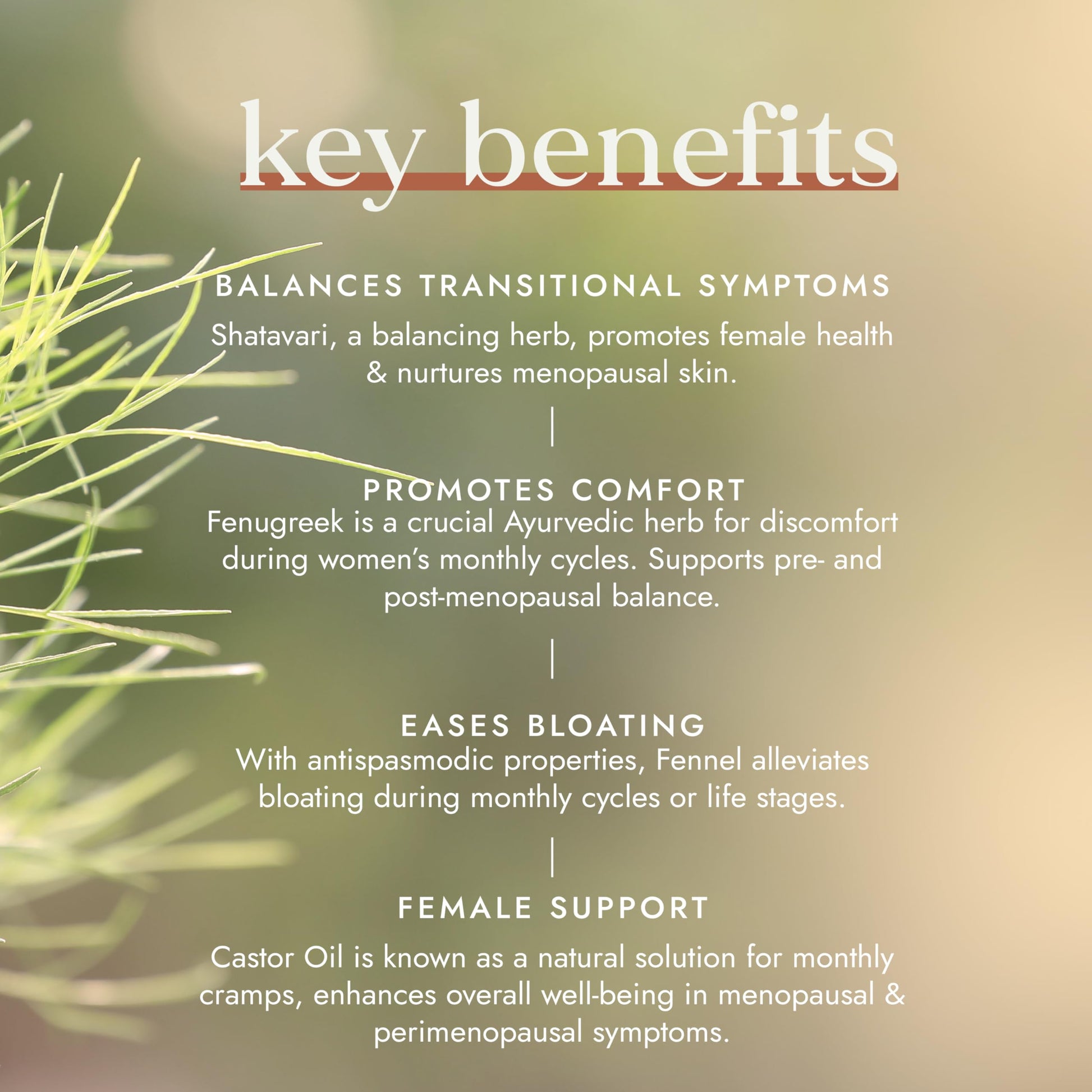 - Natural Symptom Relief - Handcrafted with Shatavari to ease transitional symptoms and nurture menopausal skin. Fenugreek targets discomfort and bloating, ensuring comfort in both pre- and post-menopause stages.
